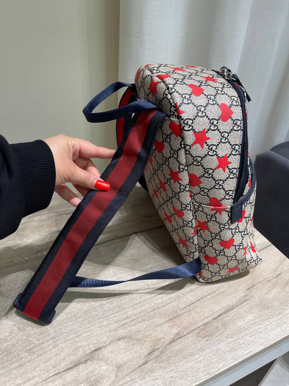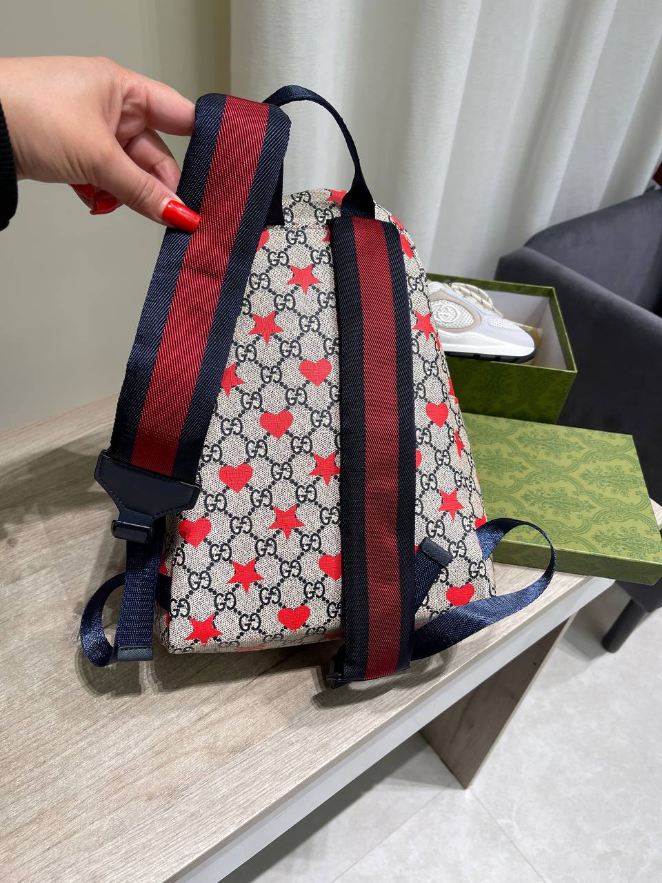 Рюкзак Gucci LUX-118554 — стильный аксессуар, воплощающий в себе узнаваемый дизайн бренда. Сочетание фирменного принта, ярких акцентов в виде красных сердец и звезд, а также практичной конструкции делают его идеальным выбором для повседневного использования.