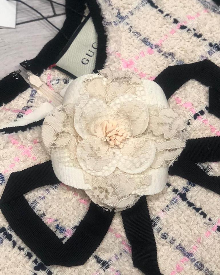 Этот сарафан Gucci LUX-8379 представляет собой изысканное творение в классическом стиле. Его нежный кремовый фон, украшенный контрастной клеткой и вкраплениями розового, создает элегантный и утонченный образ. Детали в виде черной окантовки и объемного банта с цветочным акцентом придают сарафану особый шарм и женственность.