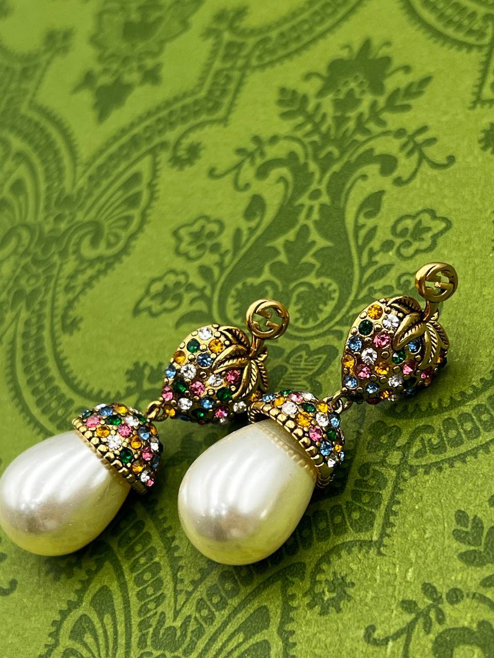 Серьги Gucci LUX-102113 — изысканное украшение, которое подчеркнет ваш стиль и добавит нотку роскоши в любой образ. Эти серьги сочетают в себе элегантность и игривость, идеально подходящие для особых случаев и повседневной носки. Они выполнены в золотом цвете, украшены камнями разных цветов, а также крупными жемчужинами.