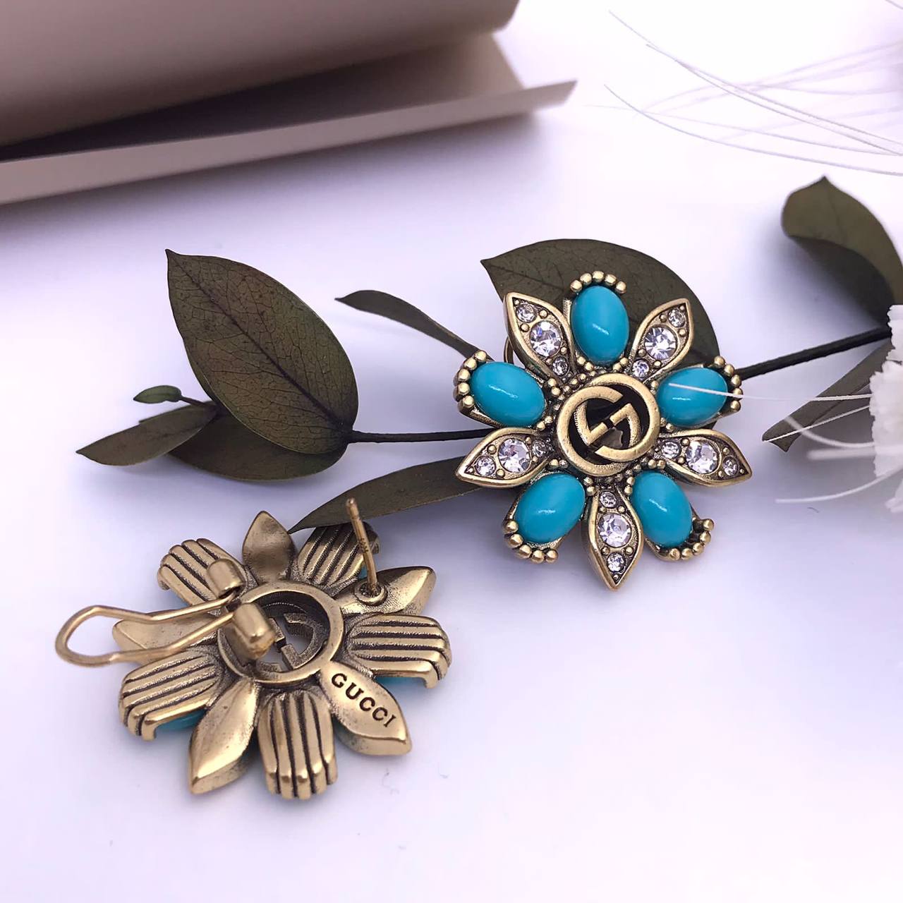 Серьги Gucci LUX-87419 — это изысканное ювелирное украшение, которое сочетает в себе элегантность и неповторимый стиль. Серьги выполнены в форме цветка, где каждый лепесток украшен бирюзовыми камнями, а центр дополнен логотипом бренда. Этот аксессуар станет прекрасным дополнением к любому образу, добавляя нотку роскоши и индивидуальности.