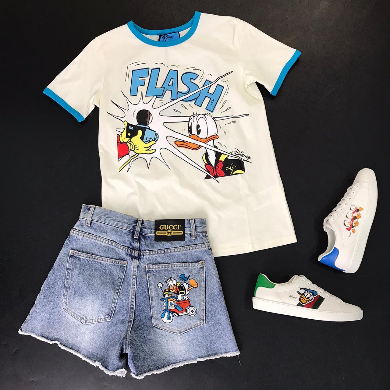 Шорты Gucci LUX-46277 представляют собой стильный элемент гардероба, сочетающий в себе узнаваемый стиль Gucci с игривым принтом из мультфильмов Disney. Эти джинсовые шорты с необработанным краем подойдут для создания непринужденных и модных образов в теплое время года.