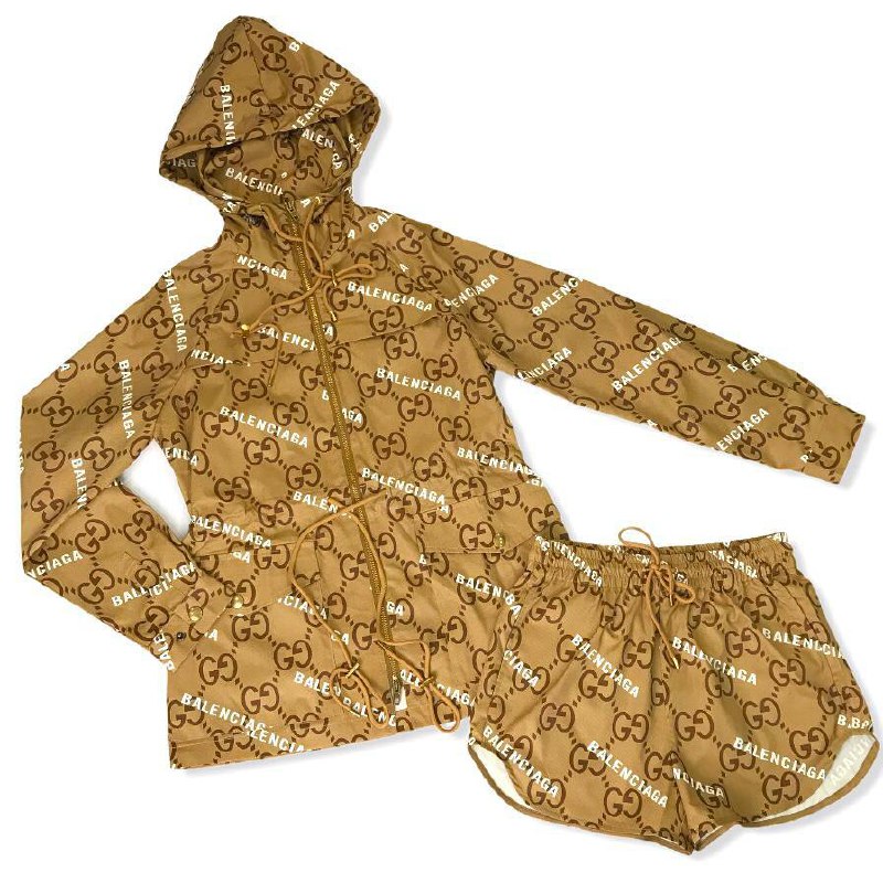Комплект из шорт и ветровки Gucci LUX-50909 — это стильное решение для создания эффектного образа. Комплект выполнен в едином дизайне с узнаваемым монограммным принтом Gucci и надписями Balenciaga. Ветровка с капюшоном на регулируемом шнурке и шорты с эластичным поясом и drawstring обеспечивают комфортную посадку. Данный комплект идеально подходит как для повседневного ношения, так и для активного отдыха.