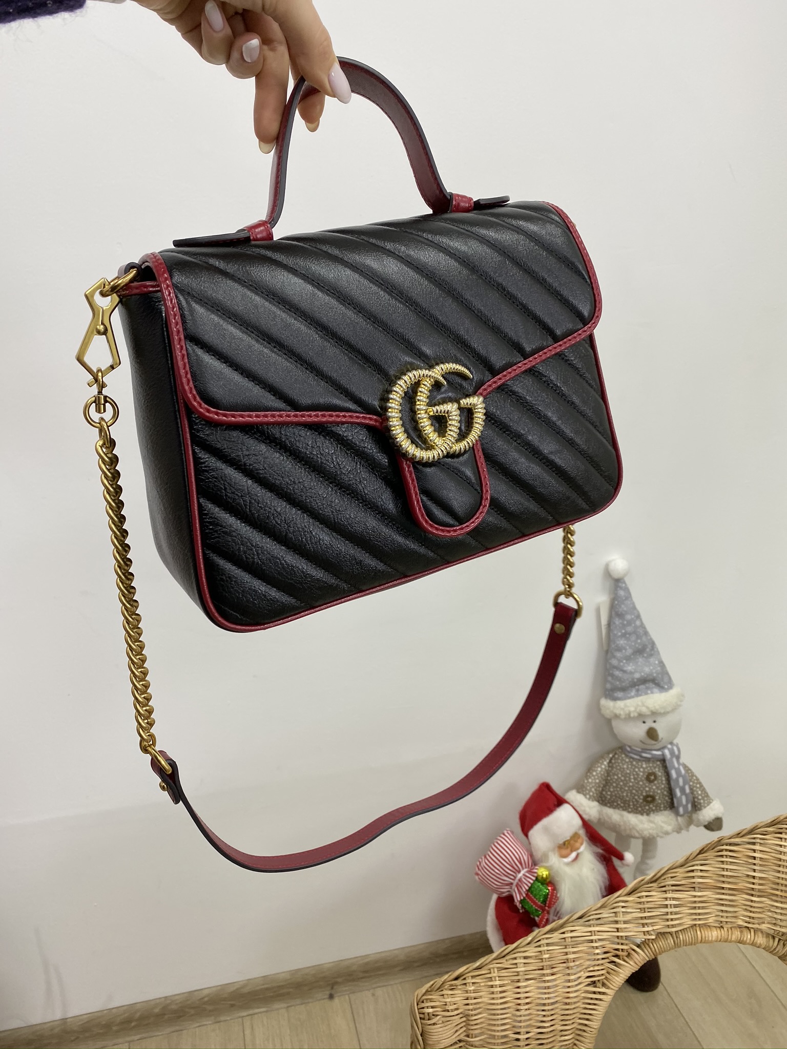 Женская сумка Gucci LUX-25266 – это элегантный аксессуар, выполненный в классическом черном цвете с контрастной красной отделкой. Стеганый дизайн в виде "елочки" и узнаваемый золотой логотип бренда придают сумке роскошный вид. Модель оснащена удобной ручкой для переноски в руке и съемным плечевым ремнем-цепочкой, что делает ее универсальной для различных образов. Эта сумка идеально подойдет для создания как дневных, так и вечерних нарядов, подчеркивая ваш безупречный стиль.