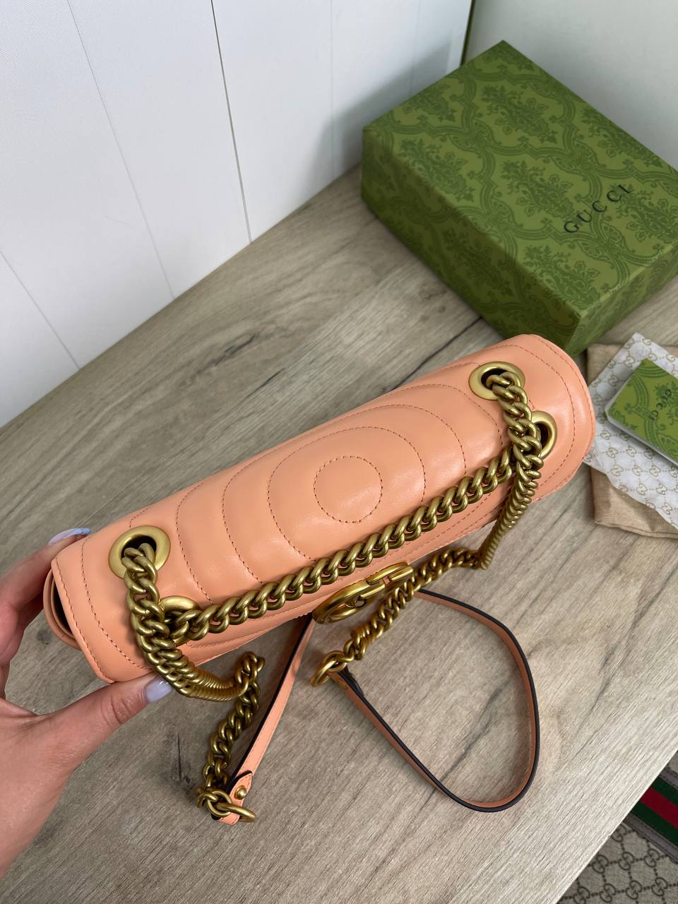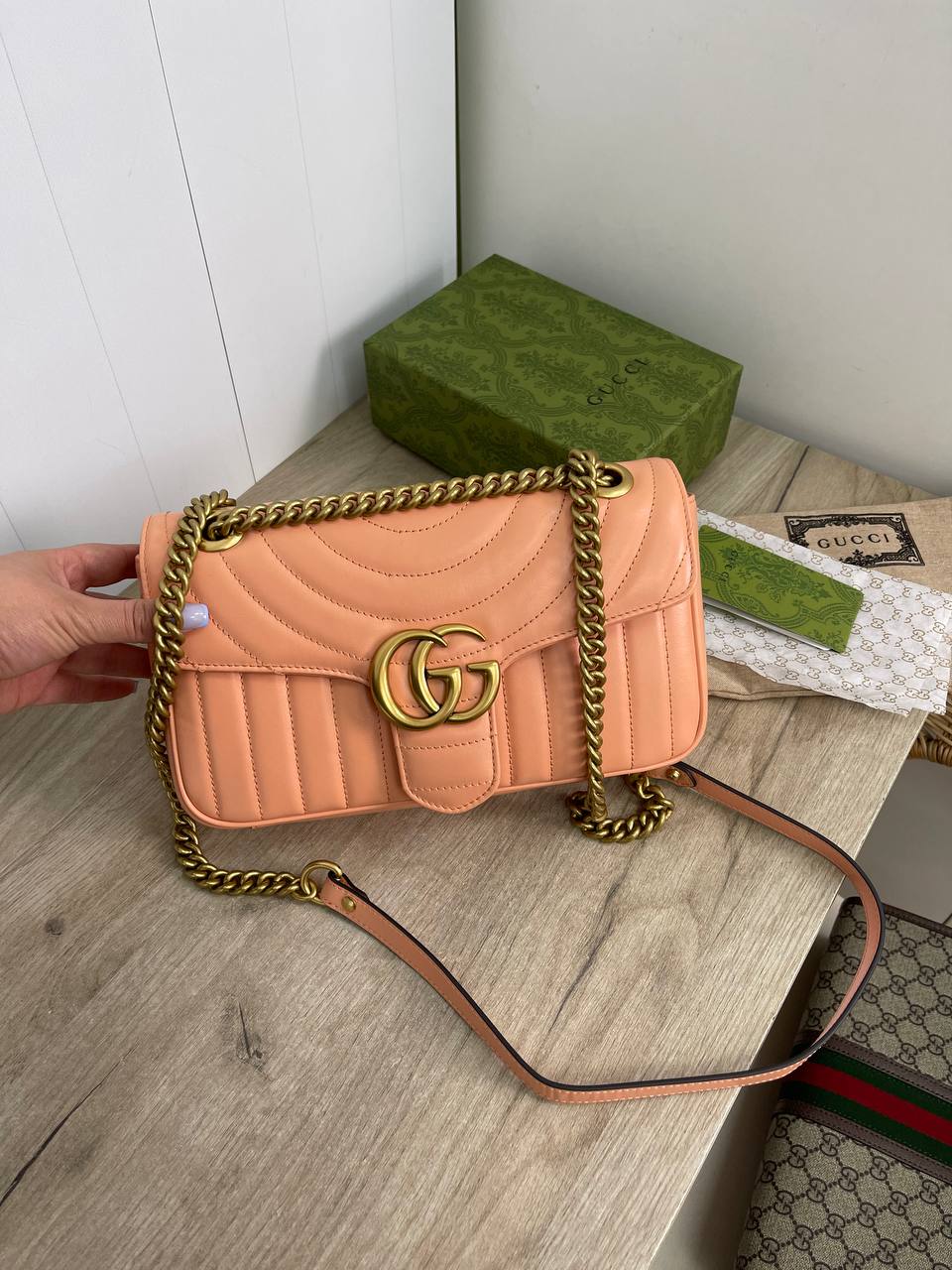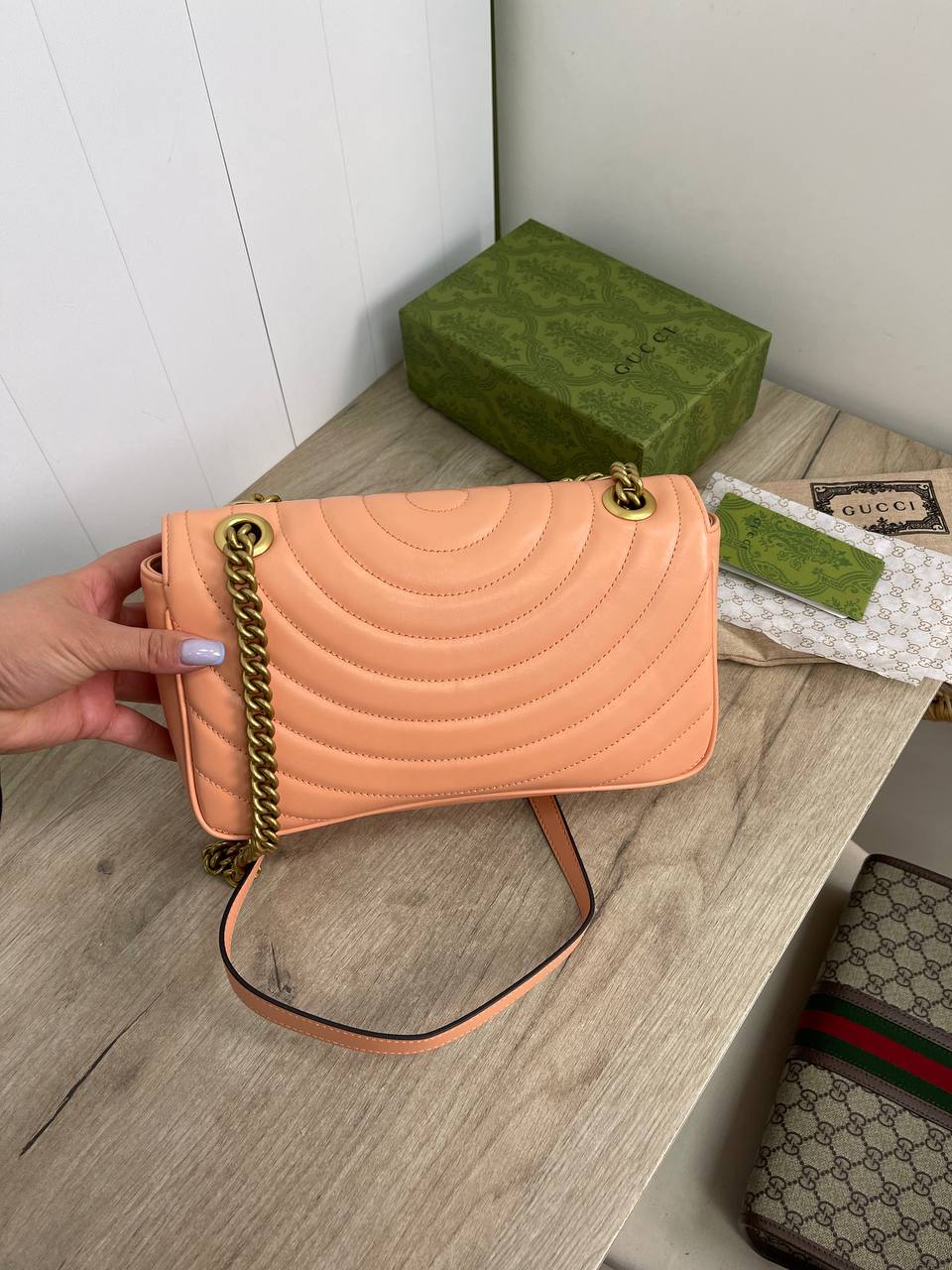 Сумка женская Gucci LUX-88708 — это элегантный аксессуар в стиле моды от Gucci. Она выполнена в нежном персиковом цвете, имеет стеганую текстуру и золотистую фурнитуру. Эта сумка идеально подходит для повседневного использования и особых случаев.