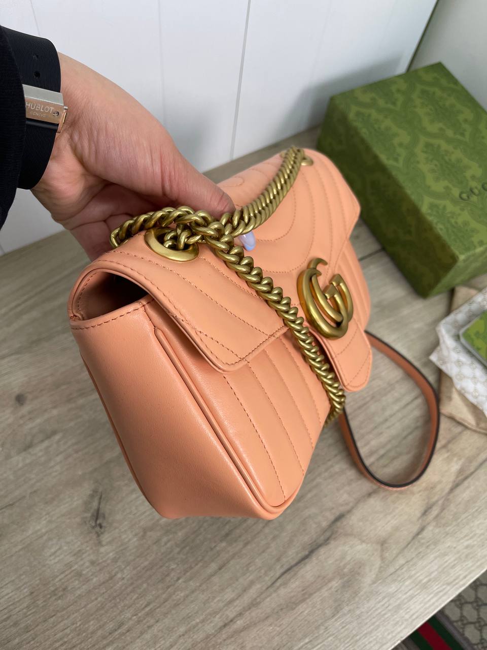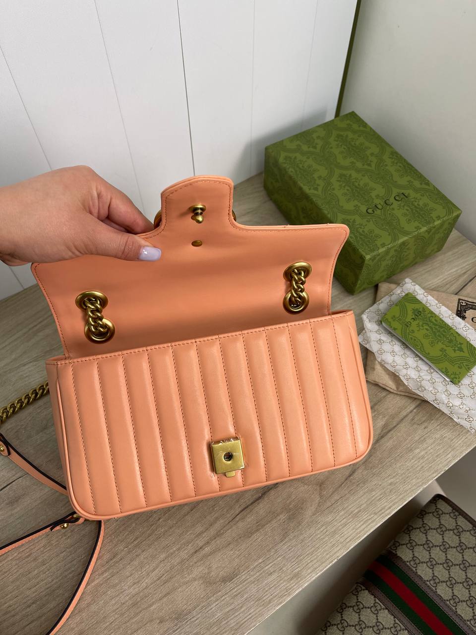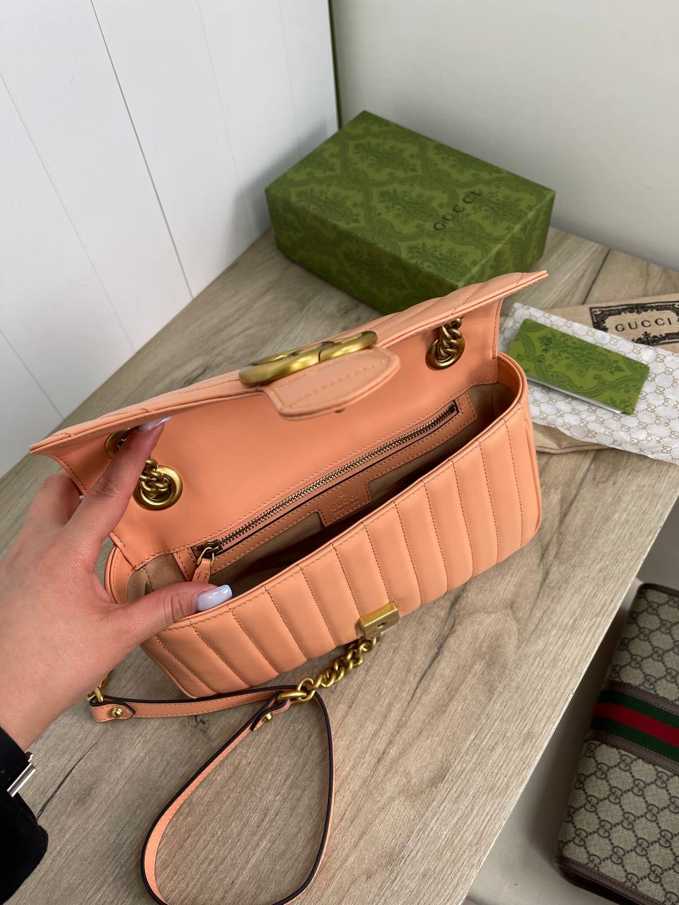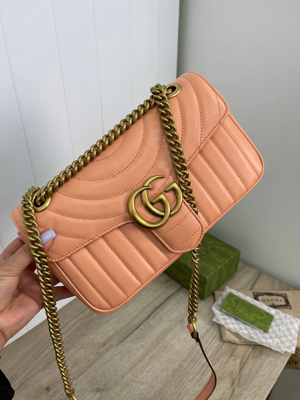 Сумка женская Gucci LUX-88708 — это элегантный аксессуар в стиле моды от Gucci. Она выполнена в нежном персиковом цвете, имеет стеганую текстуру и золотистую фурнитуру. Эта сумка идеально подходит для повседневного использования и особых случаев.
