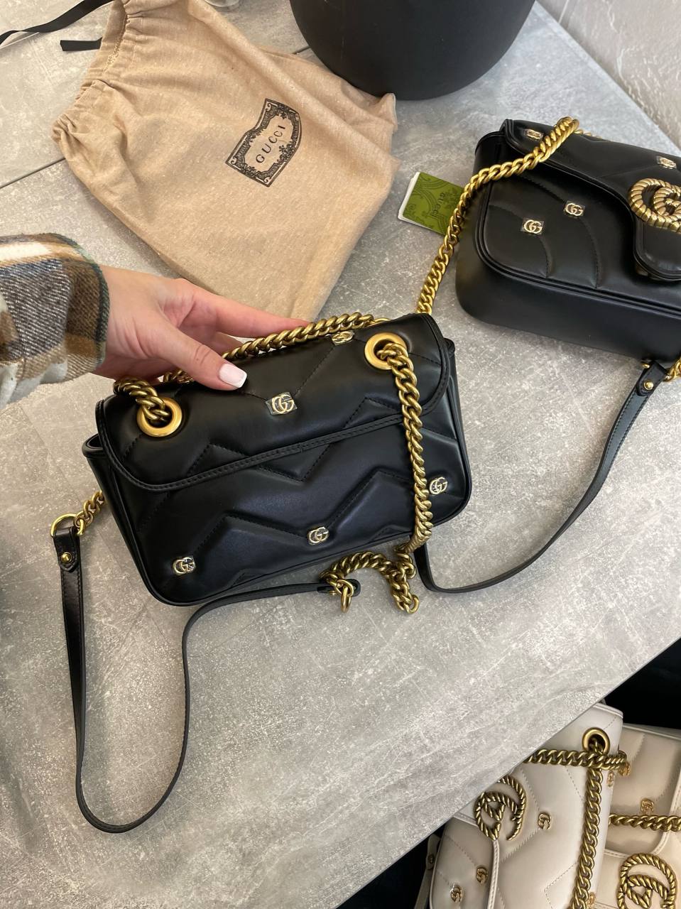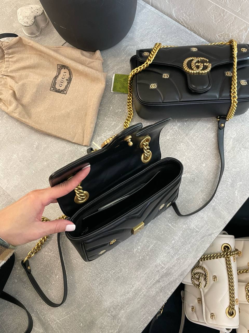 Сумка женская Gucci LUX-101580, представленная на изображении, – это изысканный аксессуар черного цвета в стеганом дизайне с золотистой фурнитурой. Сумка выполнена в классическом стиле и оснащена цепочкой.