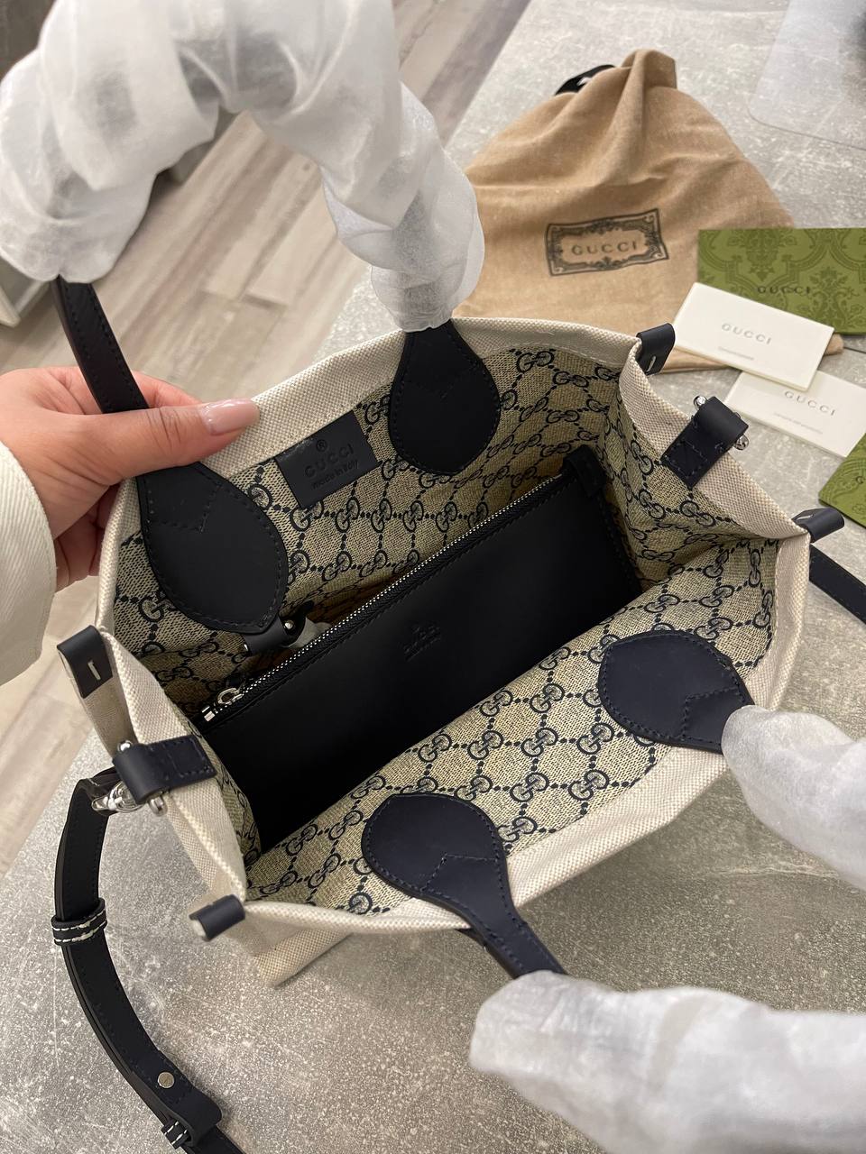 Сумка женская Gucci LUX-104474 представляет собой стильный аксессуар от известного бренда. Сумка выполнена в бежевом цвете с черными элементами, имеет текстурный дизайн и служит для повседневного использования.