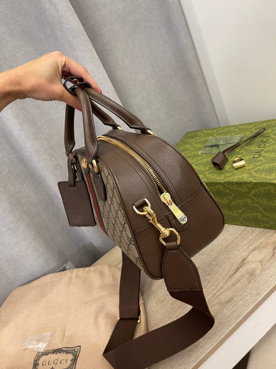 Сумка женская Gucci LUX-109137 представляет собой стильный аксессуар, сочетающий в себе элегантность и функциональность. Дизайн сумки включает в себя фирменный принт с логотипом бренда и яркие полосы в центре, что делает её узнаваемой. Идеально подходит для повседневного использования.