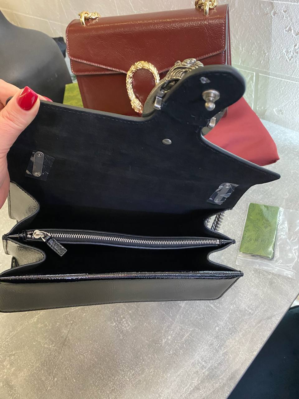 Сумка женская Gucci LUX-114223 — это элегантная черная сумка через плечо. Сумка выполнена из глянцевого материала, который придает ей роскошный вид. Застежка выполнена в виде головы змеи, а цепочка, которая является частью ремня, добавляет акцент к общему дизайну.