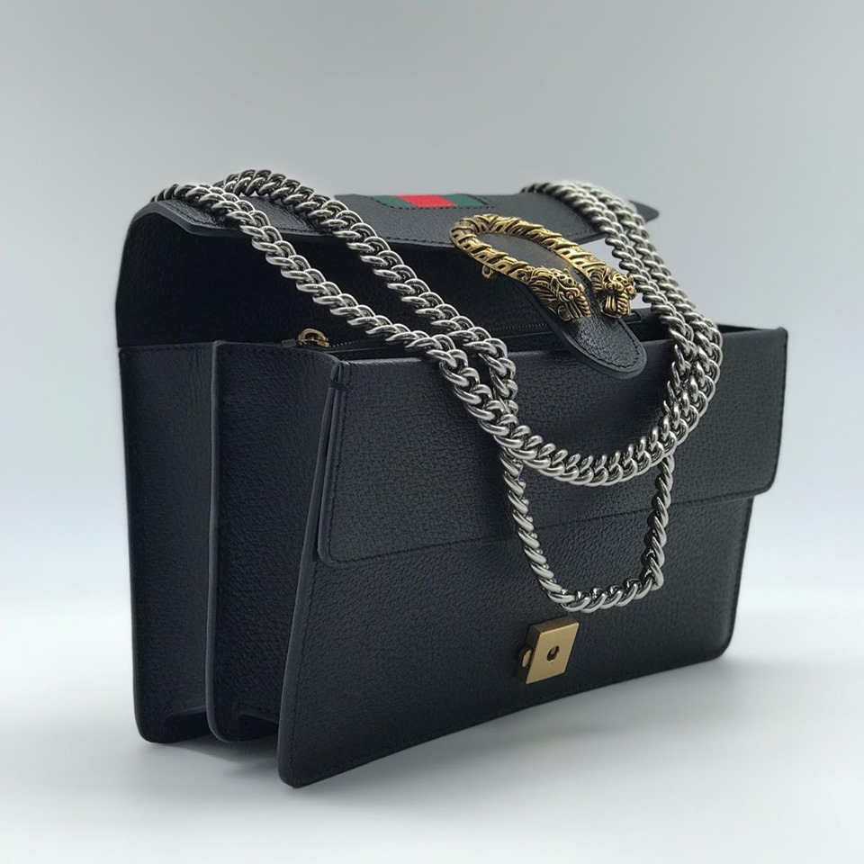 Представляем вашему вниманию женскую сумку Dionysus Gucci LUX-15225 – элегантный аксессуар, созданный для современных модниц. Сумка выполнена в классическом черном цвете и декорирована фирменной красно-зеленой полосой Gucci, что придает ей узнаваемость и изысканность. Оригинальная застежка в виде головы змеи с золотистым напылением добавляет образу роскоши.