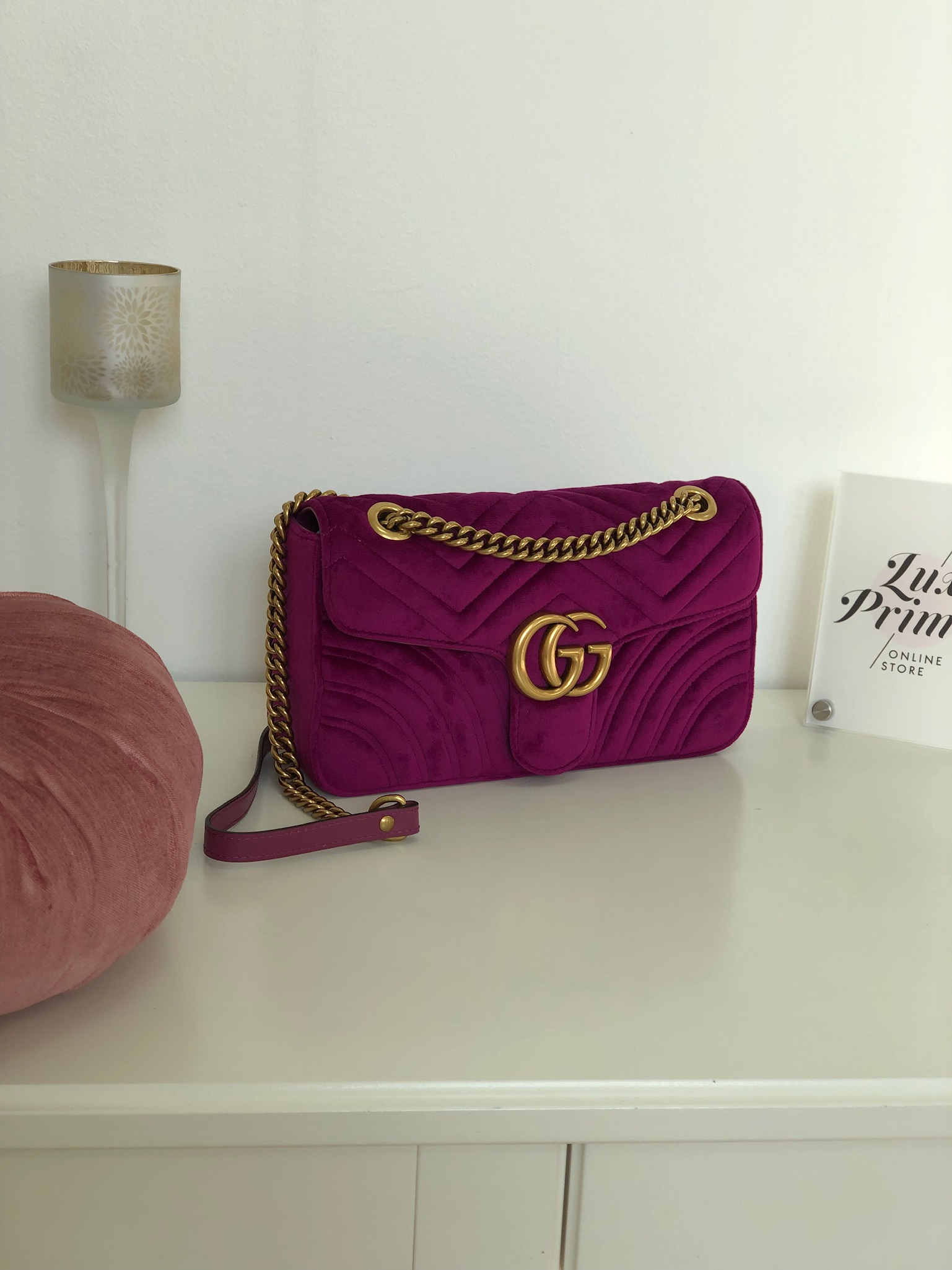 Эта женская сумка Gucci LUX-17450 выполнена в элегантном стиле, который подчеркивает статус и изысканный вкус своей владелицы. Насыщенный фиолетовый цвет бархата, переливающийся на свету, в сочетании с культовым золотым логотипом "GG" и фактурным узором в виде стеганых ромбов, делает эту сумку поистине роскошной. Аккуратная золотая цепочка и кожаный ремешок обеспечивают удобство ношения, а компактные размеры идеально подходят для вечерних выходов или дополнения элегантного дневного образа.