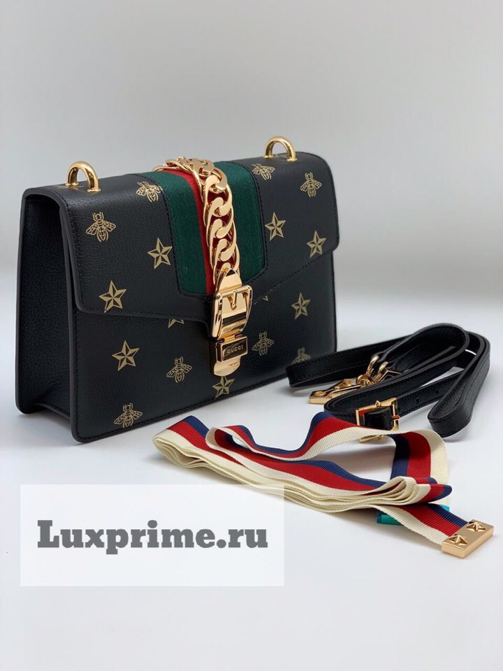 Стильная женская сумка Gucci СЖ-504 выполнена в классическом черном цвете с узнаваемыми элементами бренда. Декоративные принты в виде пчел и звезд, а также фирменная трехцветная полоса с золотой цепочкой, придают сумке изысканный и узнаваемый вид. Этот аксессуар идеально дополнит как повседневный, так и вечерний образ, подчеркивая ваш безупречный вкус.