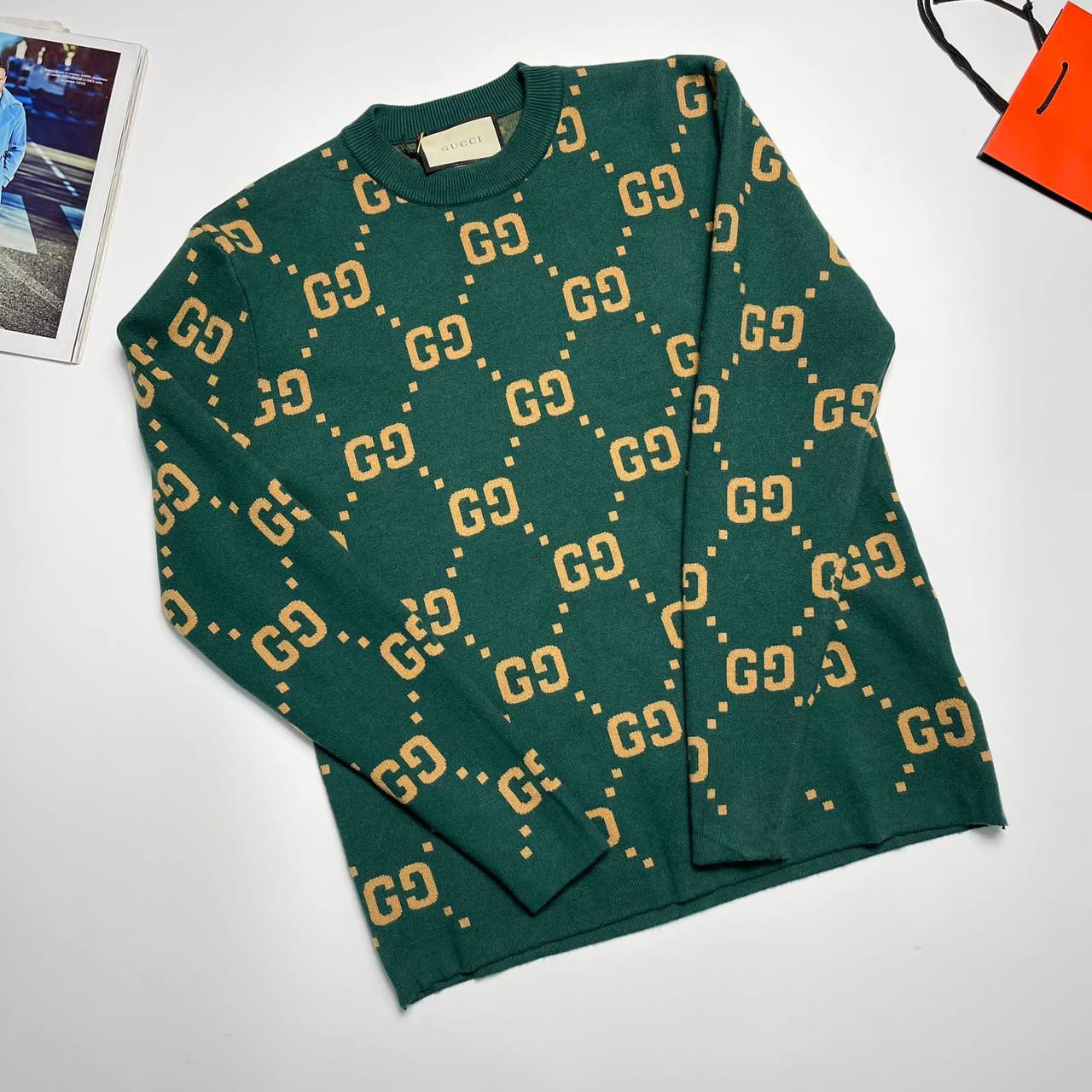 Свитер мужской Gucci LUX-99222 — это стильный предмет гардероба от известного бренда. Свитер выполнен в зеленом цвете с узнаваемым логотипом по всей поверхности. Его можно носить как повседневную одежду, так и для создания более элегантных образов.