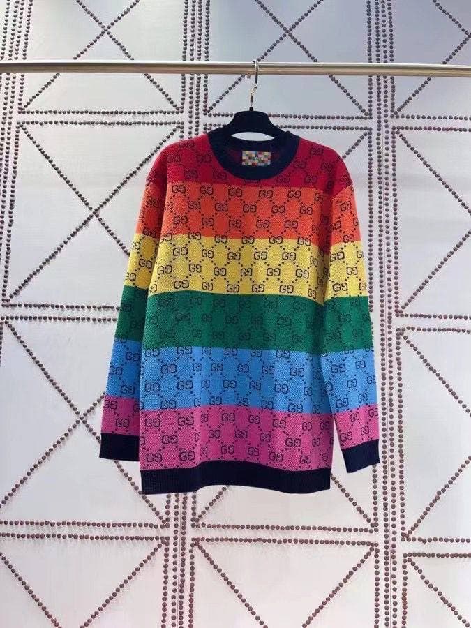 Gucci свитер женский LUX-57465 представляет собой стильный и яркий предмет одежды, выполненный в оригинальном дизайне. Свитер украшен узнаваемым логотипом Gucci, повторяющимся на фоне радужных полос, что придает ему узнаваемость и роскошный вид. Это идеальный выбор для тех, кто ценит модные тренды и хочет добавить красок в свой гардероб.