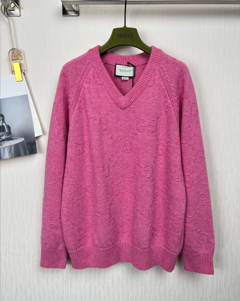 Свитер женский Gucci LUX-75790 представляет собой стильный предмет гардероба. Розовый свитер с V-образным вырезом имеет текстурированную поверхность с повторяющимся узором. Этот свитер идеально подходит для создания элегантных и комфортных образов.