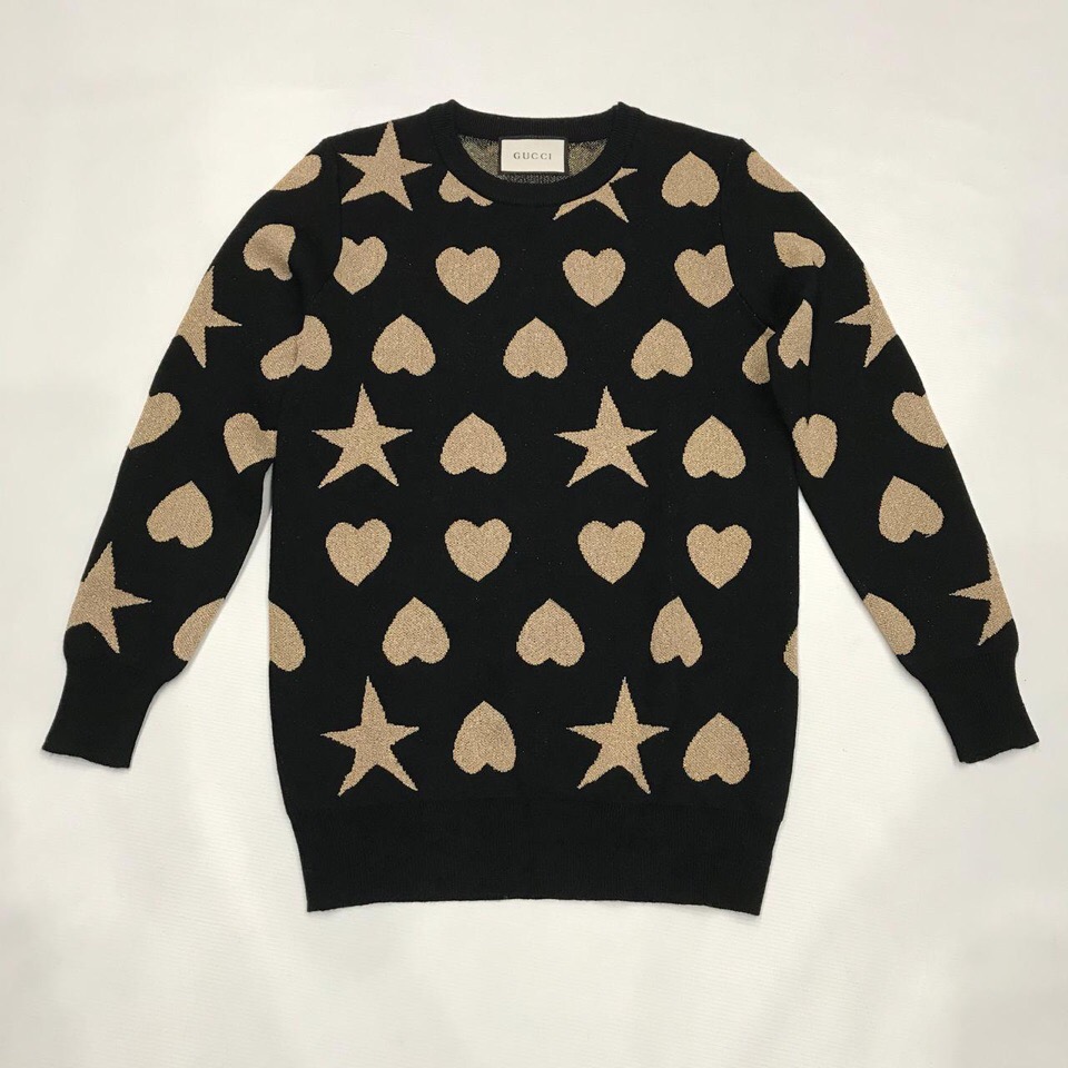 Женский свитер Gucci ОДЖ-046 представляет собой элегантное и стильное решение для создания модных образов. Классический черный фон украшен игривым принтом из золотистых звезд и сердец, что придает изделию неповторимый шарм. Этот свитер станет ярким акцентом вашего гардероба, идеально подходящим как для повседневных выходов, так и для особых случаев.