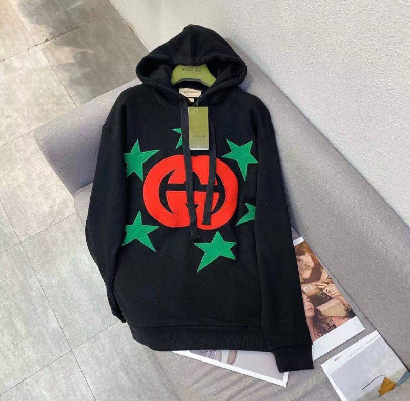 Толстовка Gucci LUX-55801 – это стильный и комфортный предмет гардероба, выполненный в классическом черном цвете. Модель украшена контрастным принтом в виде логотипа бренда и зеленых звезд, что придает ей уникальный вид. Толстовка с капюшоном идеально подойдет для создания повседневных образов.