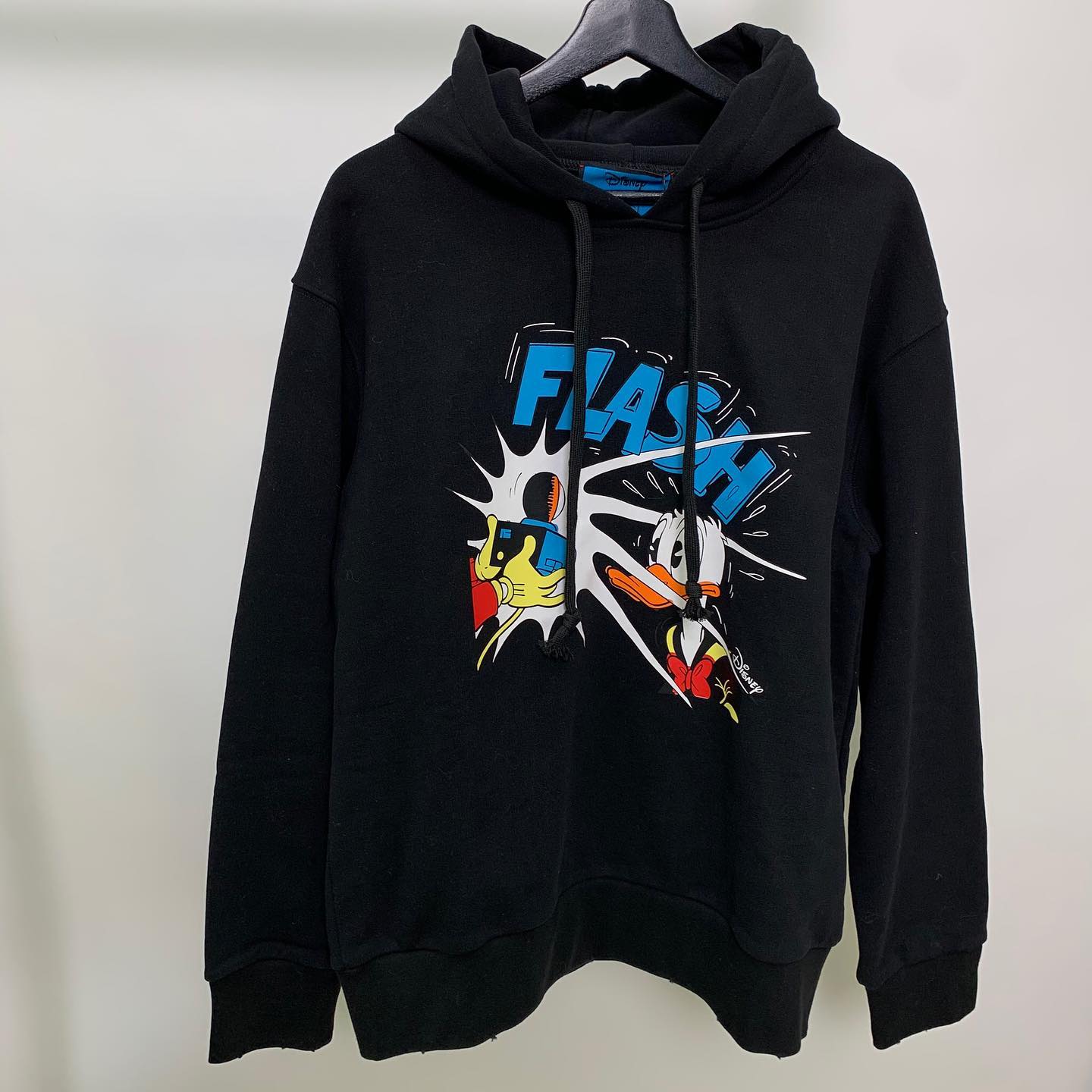 Эта черная толстовка Gucci LUX-44142 отличается ярким принтом с изображением Дональда Дака в стиле комиксов. Модель с капюшоном и регулируемыми шнурками создает расслабленный образ. Она идеально подходит для повседневной носки, сочетая в себе комфорт и оригинальный дизайн.
