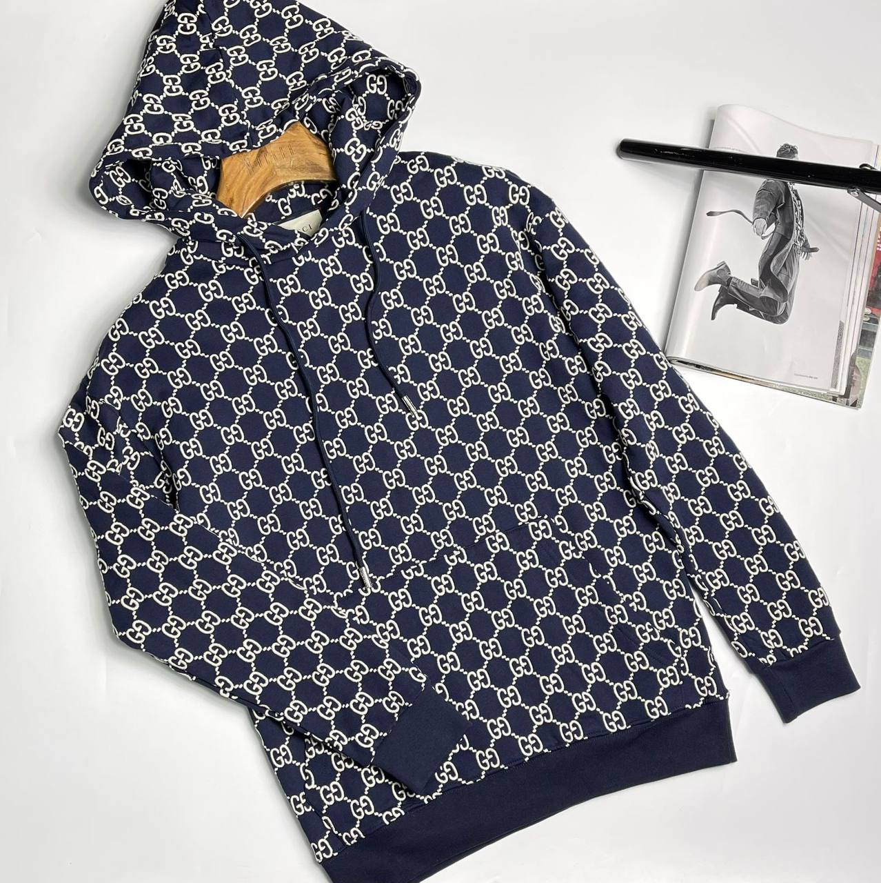Толстовка Gucci LUX-77952 представляет собой стильный элемент гардероба с узнаваемым дизайном. Толстовка выполнена в классическом стиле с капюшоном и длинными рукавами. Темно-синий фон дополнен светлым узором, а манжеты и низ изделия выполнены в однотонном синем цвете.