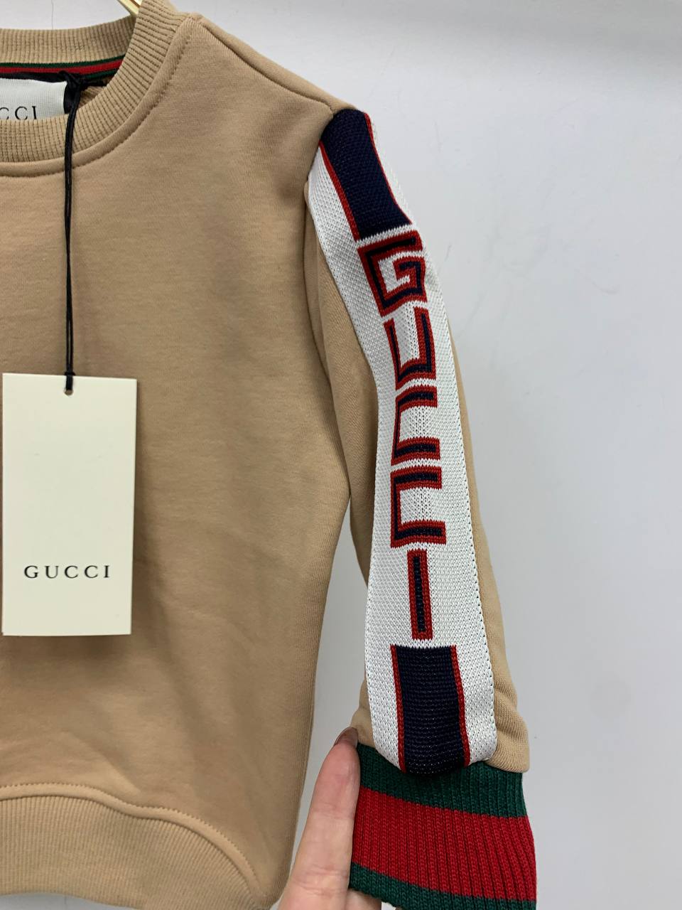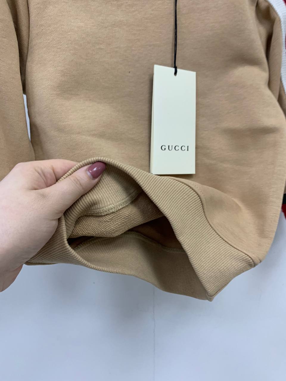 Толстовка Gucci LUX-83020 – это стильный предмет гардероба для детей, который сочетает в себе элегантность и комфорт. Толстовка выполнена в классическом стиле, с круглым вырезом и длинными рукавами. Бежевый цвет основы дополнен контрастными полосами на рукавах и манжетах, придавая изделию неповторимый вид.