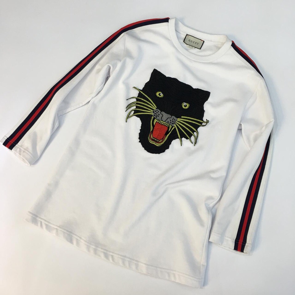 Представляем мужскую толстовку Gucci ОДЖ-320 – яркий элемент гардероба, сочетающий в себе спортивный стиль и узнаваемый дизайн бренда. Белый цвет основы дополнен контрастными полосами на рукавах и эффектной вышивкой в виде головы черной пантеры с открытой пастью. Эта модель идеально подойдет для создания непринужденных, но стильных образов.