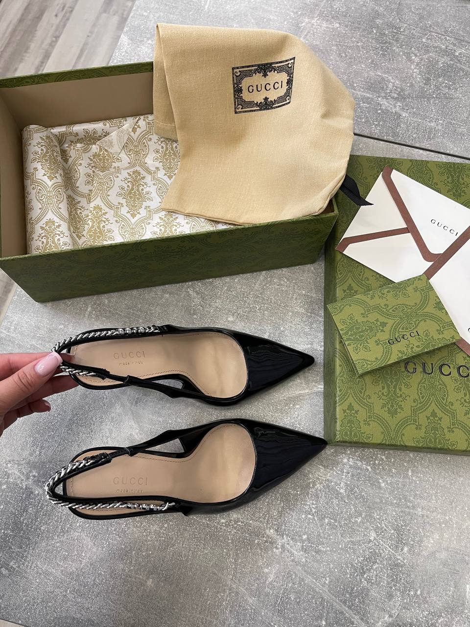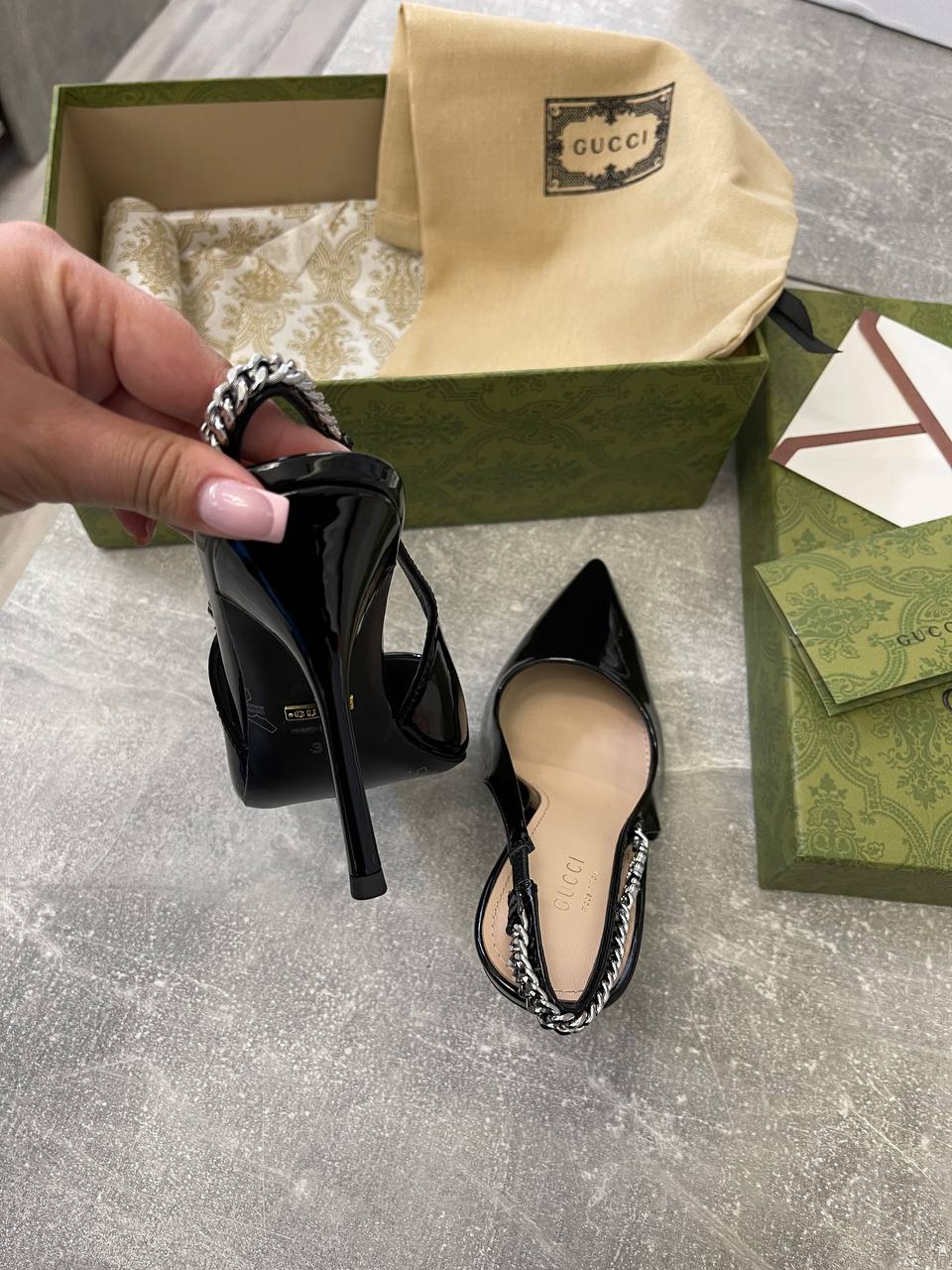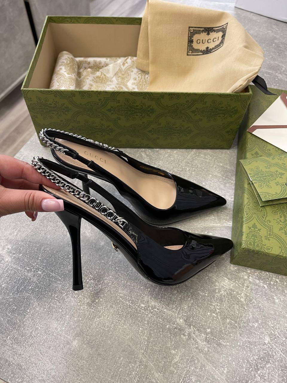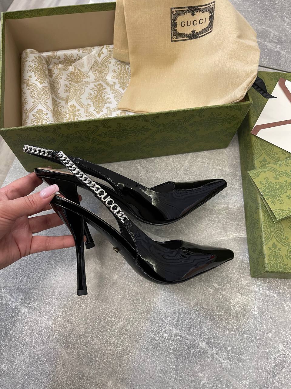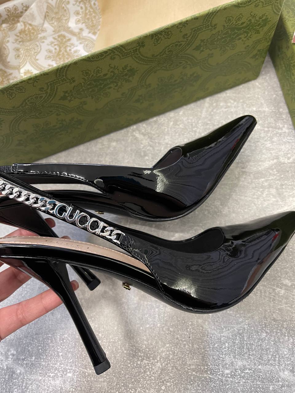 Туфли Gucci LUX-105350 — это воплощение элегантности и стиля. Чёрные лаковые туфли с острым носком и изящной цепочкой на заднике, украшенной логотипом бренда, выглядят роскошно и утонченно. Эта модель идеально подойдет для создания вечерних образов, подчеркивая женственность и изысканный вкус своей обладательницы.