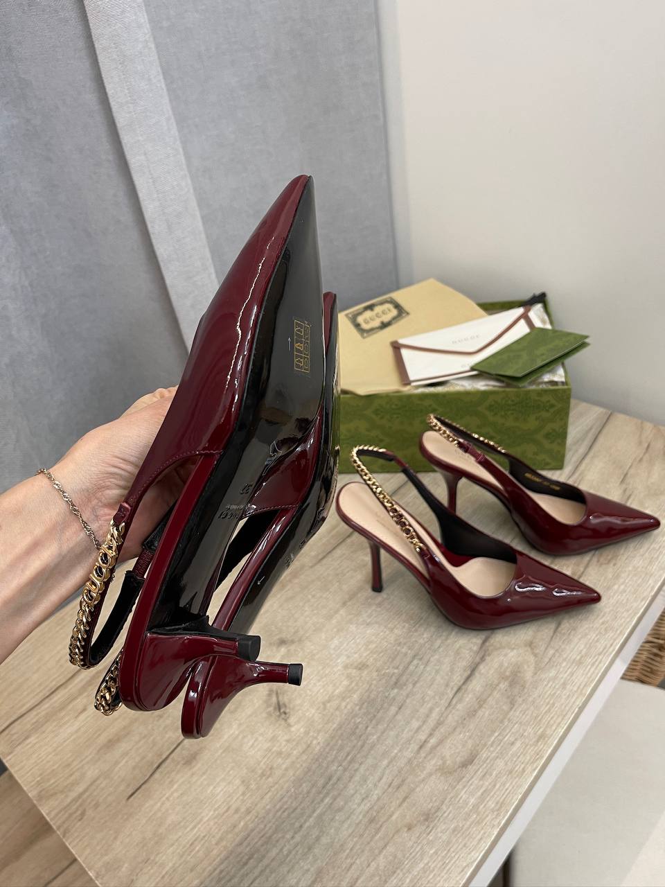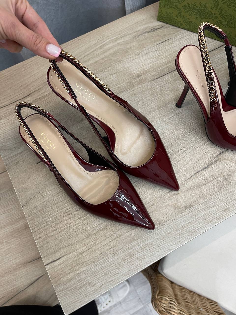 Туфли Gucci LUX-107474 — элегантные туфли-лодочки от Gucci, выполненные в бордовом цвете с острым мысом и высоким каблуком. Дизайн дополнен изящной цепочкой, что придает обуви шик и изысканность. Идеально подойдут для создания утонченных образов.