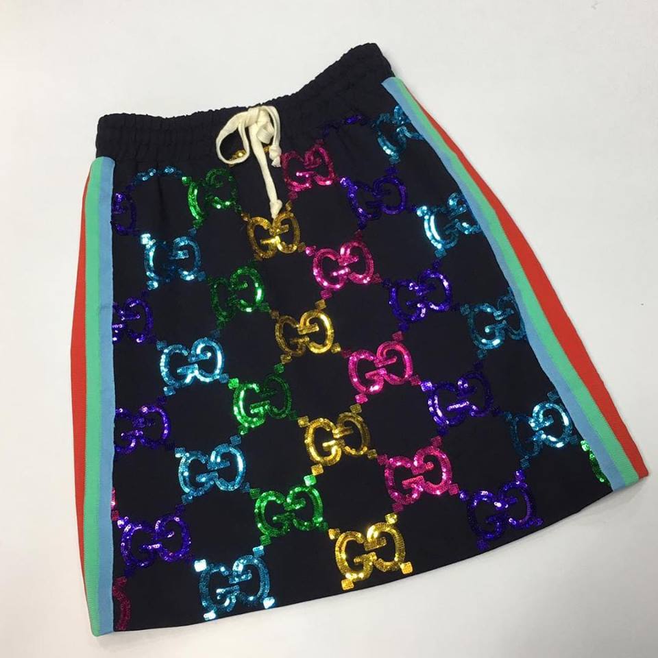 Юбка Gucci LUX-10022 — это яркое и эффектное изделие, выполненное в стиле casual. Черная основа юбки усыпана пайетками с логотипом бренда Gucci, переливающимися всеми цветами радуги, что придает ей праздничный и молодежный вид. Модель оснащена эластичным поясом и шнурком для регулировки посадки, а по бокам расположены контрастные полосы, выполненные в фирменных цветах Gucci.