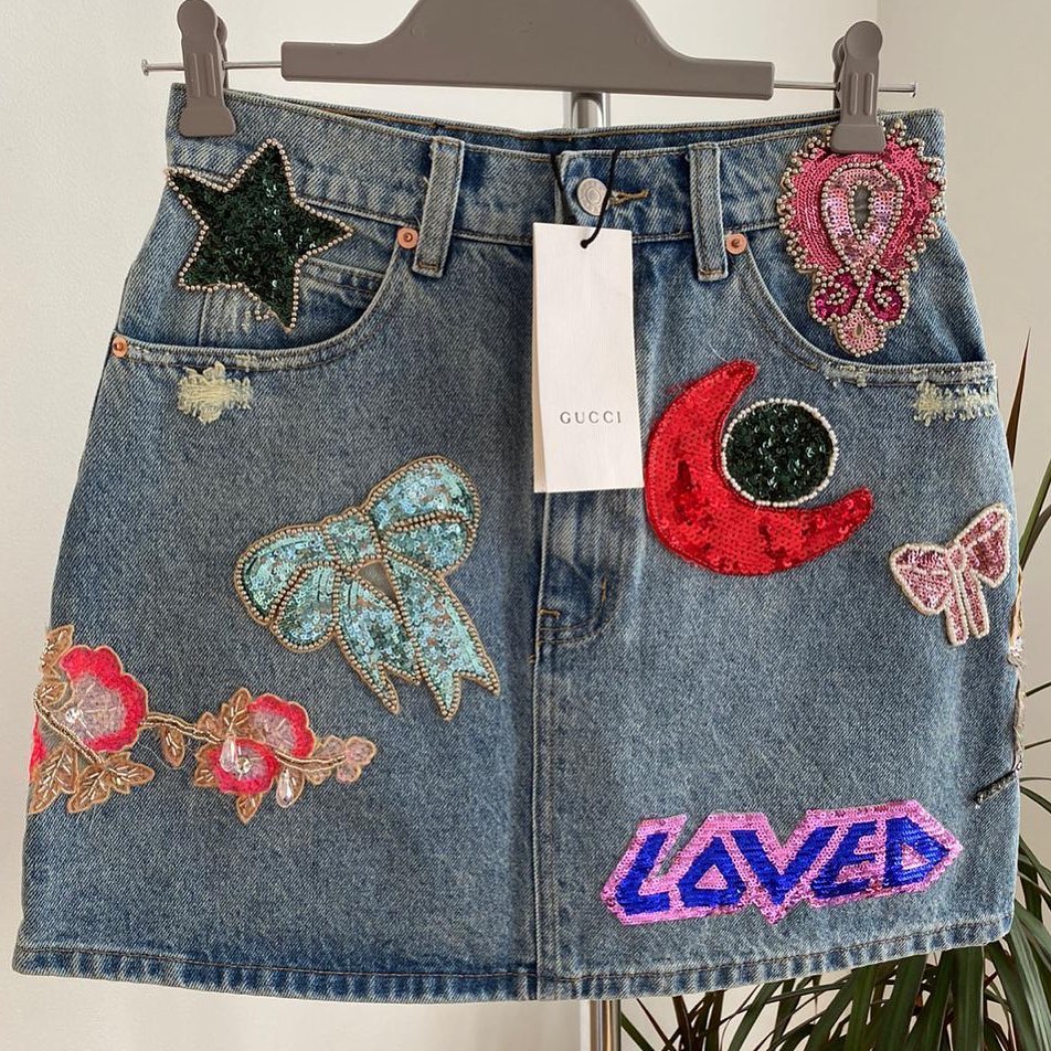 Представляем стильную джинсовую юбку Gucci LUX-31399, декорированную яркими аппликациями и вышивкой. Эта модель от Gucci воплощает в себе игривый и эксклюзивный дизайн, идеально подходящий для создания запоминающихся образов. Юбка украшена пайетками, бисером и тематическими элементами, добавляющими индивидуальности.
