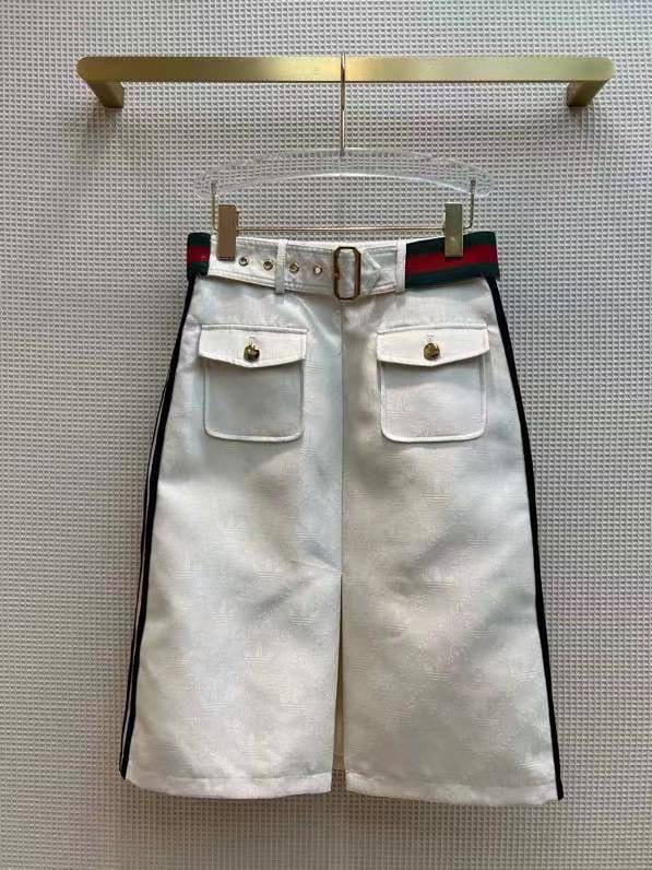 Юбка Gucci LUX-71775 – это воплощение элегантности и стиля. Белая юбка, с текстурированным узором, дополнена контрастными черными полосами по бокам, что придает ей динамичный вид. Пояс с узнаваемой красно-зеленой полосой подчеркивает талию, добавляя акцент.
