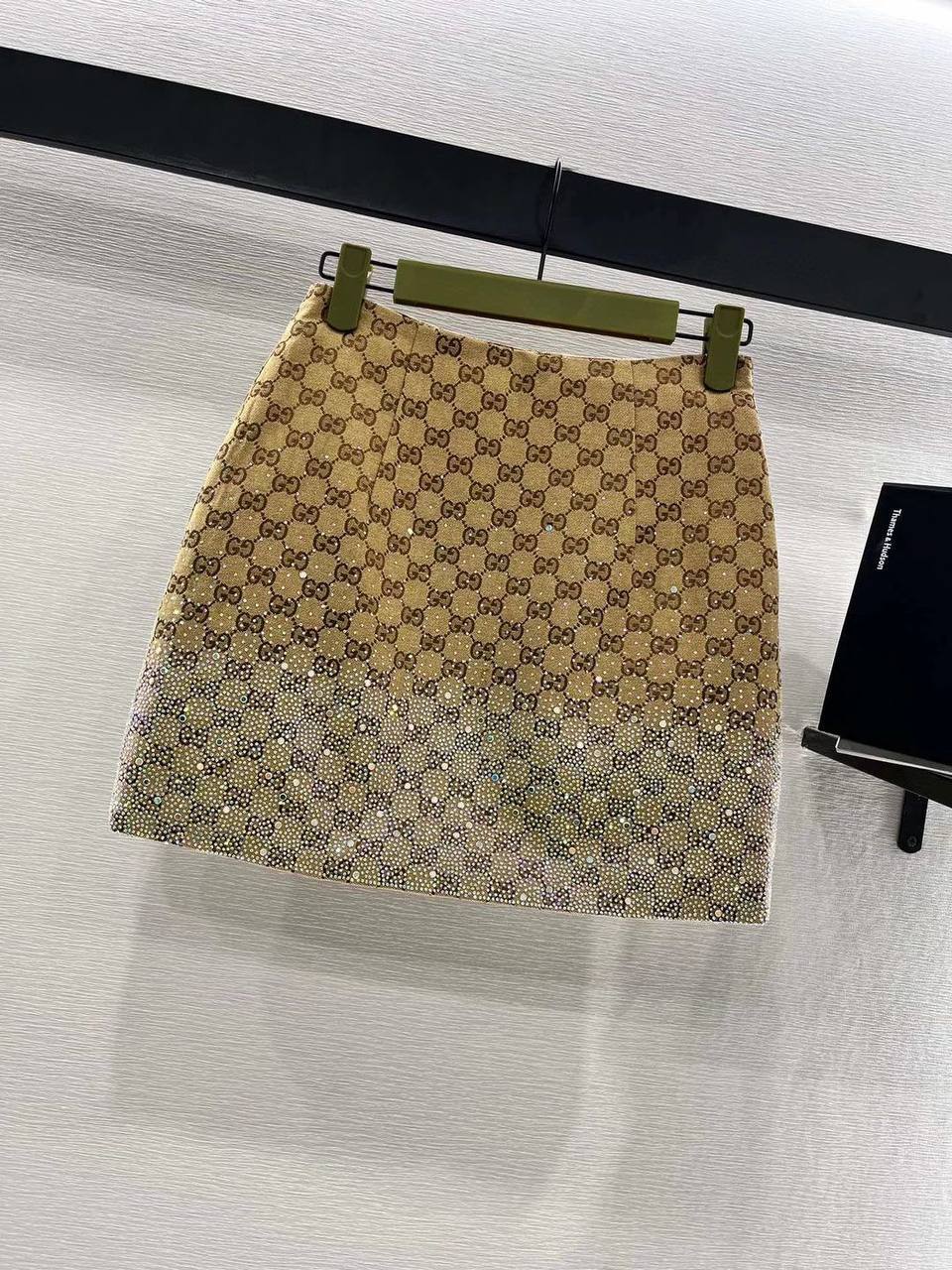 Юбка Gucci LUX-113454 — это элегантная мини-юбка в фирменном стиле бренда. Модель выполнена в базовом бежевом цвете с характерным узором логотипа и украшена сверкающими элементами, которые создают эффект градиента. Юбка предназначена для создания ярких и запоминающихся образов.
