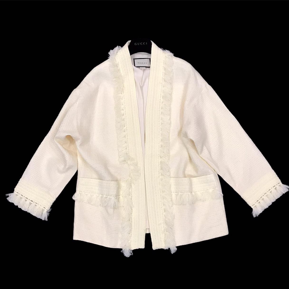 Данный жакет Gucci LUX-46282 представляет собой элегантный предмет одежды в стиле кэжуал, выполненный в нежном кремовом цвете. Его отличает минималистичный дизайн с акцентом на фактурную ткань и декоративную бахрому по краям, создавая утонченный образ.