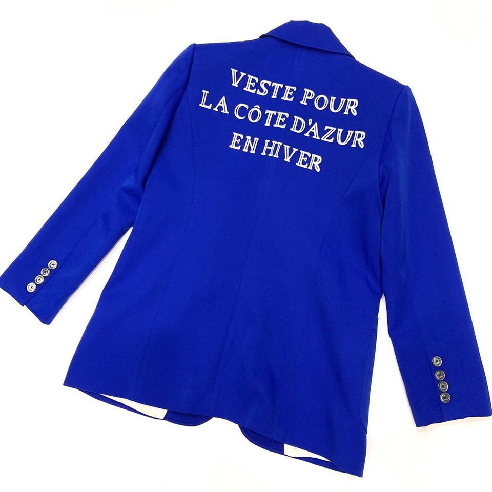 Элегантный синий жакет Gucci LUX-17756, представленный на изображении, является воплощением стиля и утонченности. Жакет украшен вышивкой "Veste pour la C?te d`Azur en Hiver" на спине, что придает ему уникальный шарм. Этот предмет одежды идеально подходит для создания как повседневных, так и более официальных образов, подчеркивая вашу индивидуальность.