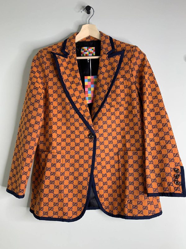 Этот яркий и стильный жакет Gucci LUX-55336, выполненный в насыщенном оранжевом цвете, мгновенно привлекает внимание своим узнаваемым монограммным принтом GG. Контрастная темно-синяя окантовка по воротнику, краям и манжетам придает изделию элегантность и завершенность. Пиджак застегивается на одну пуговицу, а на рукавах присутствуют декоративные пуговицы. Модель идеально подходит для создания запоминающихся образов в стиле casual chic, а также может стать эффектным акцентом в более формальном наряде.