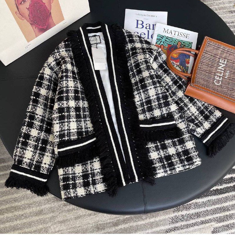 Жакет Gucci LUX-55427 — это элегантное изделие, выполненное в классическом стиле и декорированное актуальными элементами. Данный жакет отличается эффектным клетчатым принтом и стильной бахромой, добавляющей образу изысканности. Идеальный выбор для создания утонченных и модных образов.