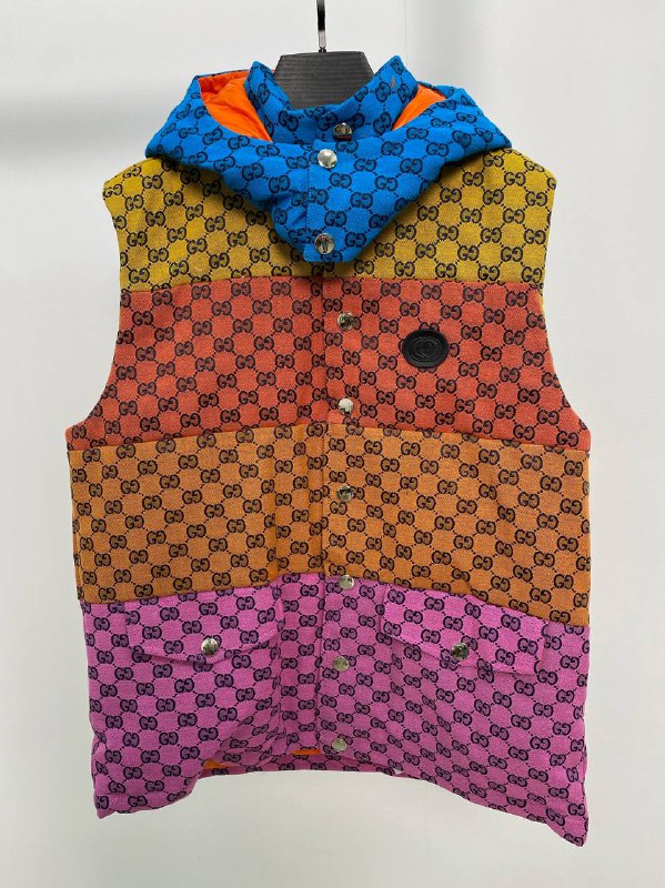 Этот яркий жилет Gucci LUX-55783 с капюшоном — воплощение смелого уличного стиля. Сочетание разноцветных блоков, украшенных узнаваемым монограммным принтом GG, делает его настоящим арт-объектом в гардеробе. Жилет идеально подойдет для тех, кто ценит индивидуальность и стремится выделиться из толпы.