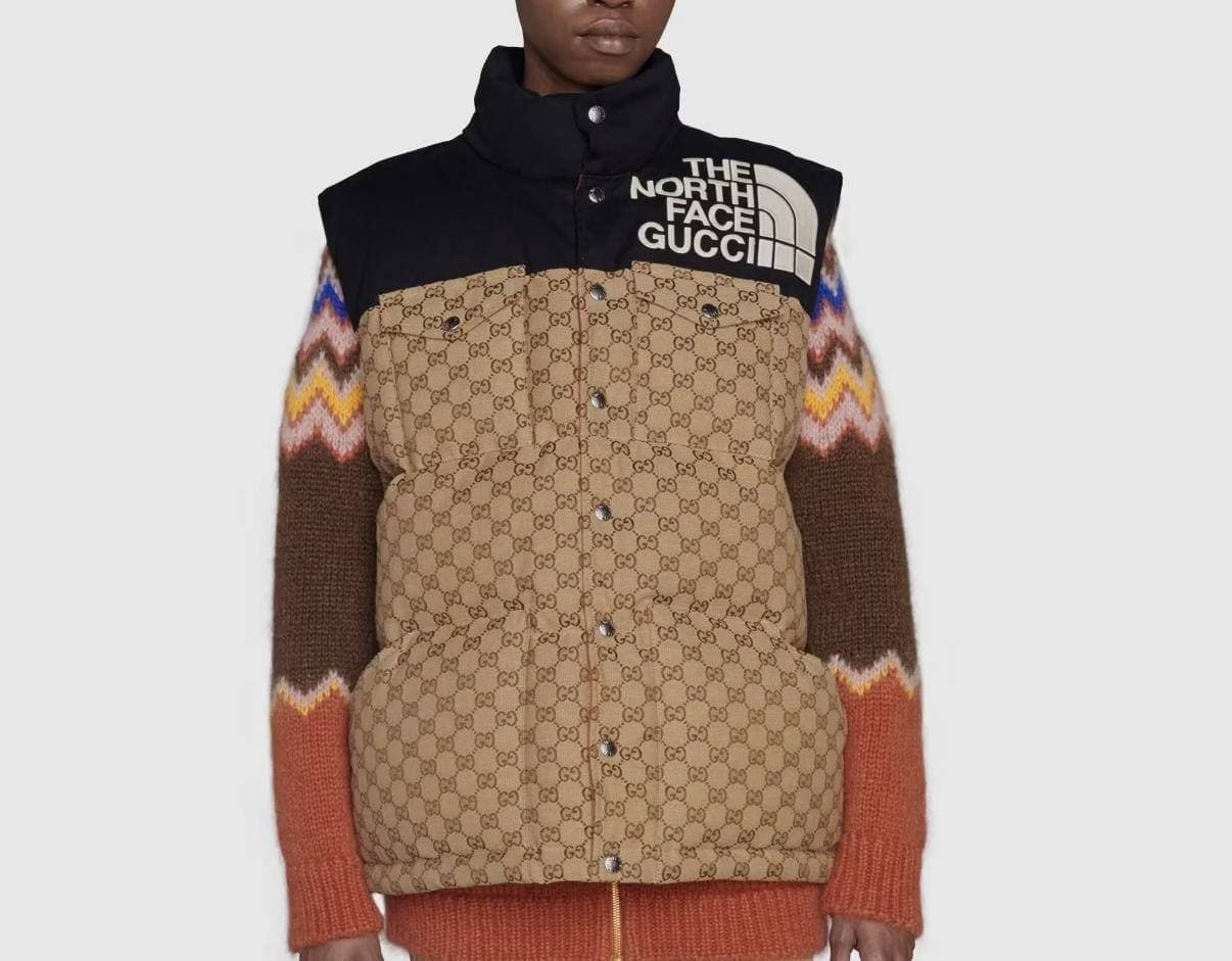 Жилет Gucci LUX-61887 представляет собой стильное и уникальное изделие, сочетающее в себе узнаваемые мотивы Gucci и эстетику спортивного бренда The North Face. Этот жилет отличается ярким дизайном, выполненным в фирменном коричневом цвете с характерным монограммным принтом GG Supreme, символизирующим роскошь и статус. Верхняя часть жилета выполнена в черном цвете и украшена логотипами Gucci и The North Face, что подчеркивает коллаборацию брендов.