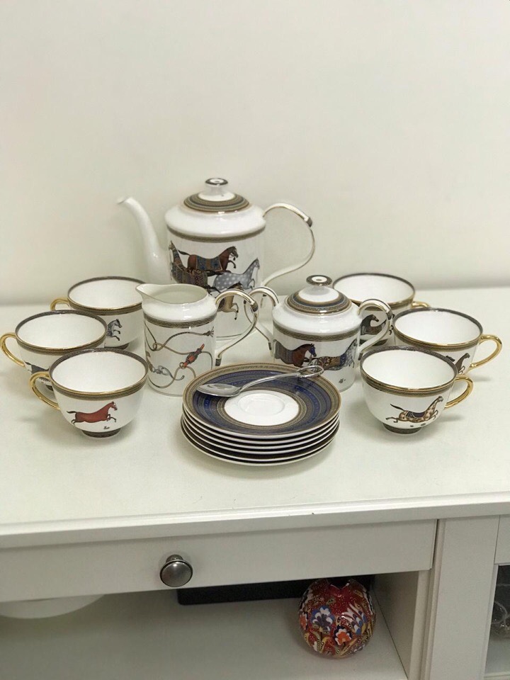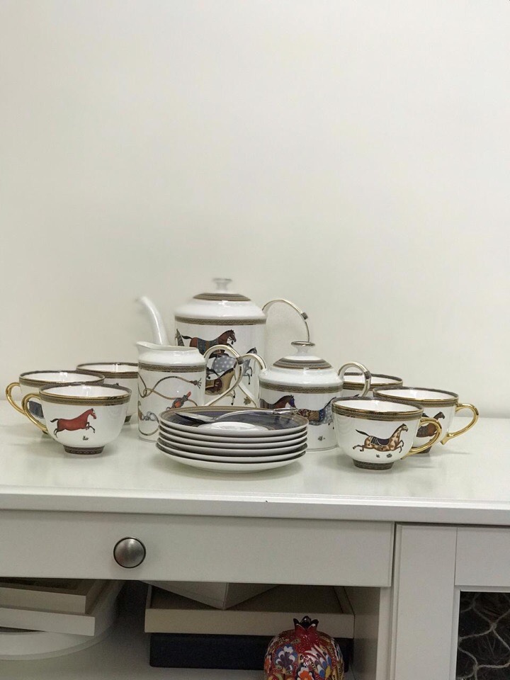 Чайный сервиз Hermes LUX-8102 представляет собой изысканный набор посуды, выполненный в классическом стиле. Дизайн украшен утонченными изображениями лошадей, что придает сервизу особую элегантность и роскошь. Этот сервиз станет прекрасным дополнением к любому интерьеру и создаст атмосферу уюта и благородства во время чаепития.