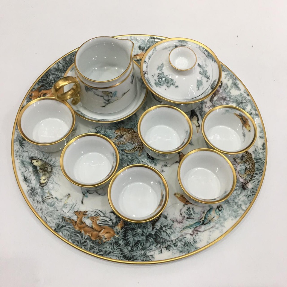 Чайный сервиз Hermes ПО-019 представляет собой изысканный набор для чаепития, выполненный в классическом стиле с элементами роскоши. Декор сервиза включает изображения птиц, леопардов, оленей и бабочек на фоне пышной зелени, что создает атмосферу элегантности и природной красоты. Золотая окантовка добавляет сервизу утонченности и эксклюзивности, делая его идеальным выбором для особых случаев или как изысканный подарок.