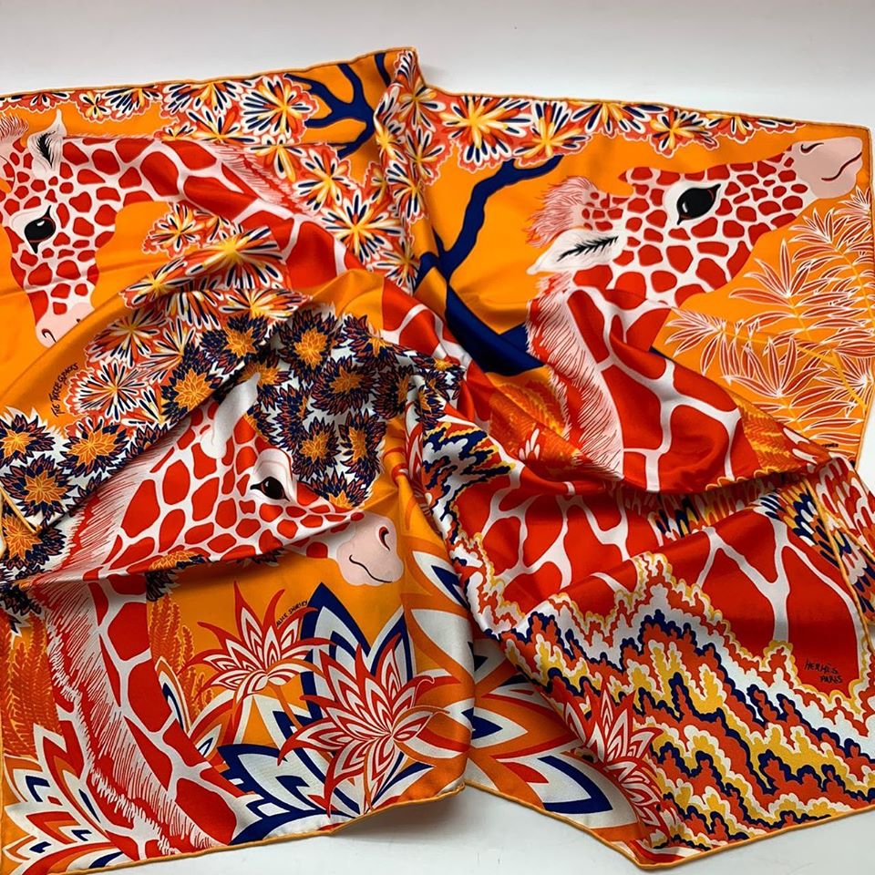 Платок Hermes LUX-30206 представляет собой яркий и стильный аксессуар, который станет эффектным дополнением к вашему образу. Этот платок, выполненный в насыщенных оранжевых, красных и синих тонах, украшен оригинальным принтом с изображениями жирафов и тропических растений. Его дизайн сочетает в себе элегантность бренда Hermes с игривым и запоминающимся мотивом, делая его по-настоящему уникальным.