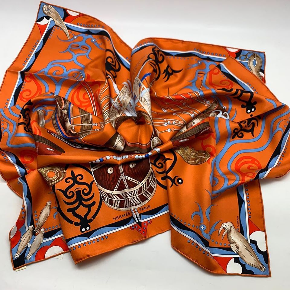 Этот шелковый платок Hermes LUX-30207 отличается ярким оранжевым основным цветом и сложным, детализированным узором. Дизайн вдохновлен этническими мотивами, на нем изображены элементы, напоминающие морских животных, традиционные орнаменты и символы. Этот аксессуар станет акцентным дополнением к вашему образу, придавая ему изысканность и уникальность.