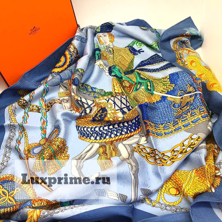 Платок Hermes АКС-787 представляет собой изысканный аксессуар, выполненный в классическом стиле бренда. На нем изображена детализированная сцена с фигурами в старинных костюмах и лошадью, окруженная узорами из канатов и цепей. Этот шелковый платок станет эффектным дополнением как к повседневному, так и к вечернему образу, придавая ему нотку роскоши и утонченности.