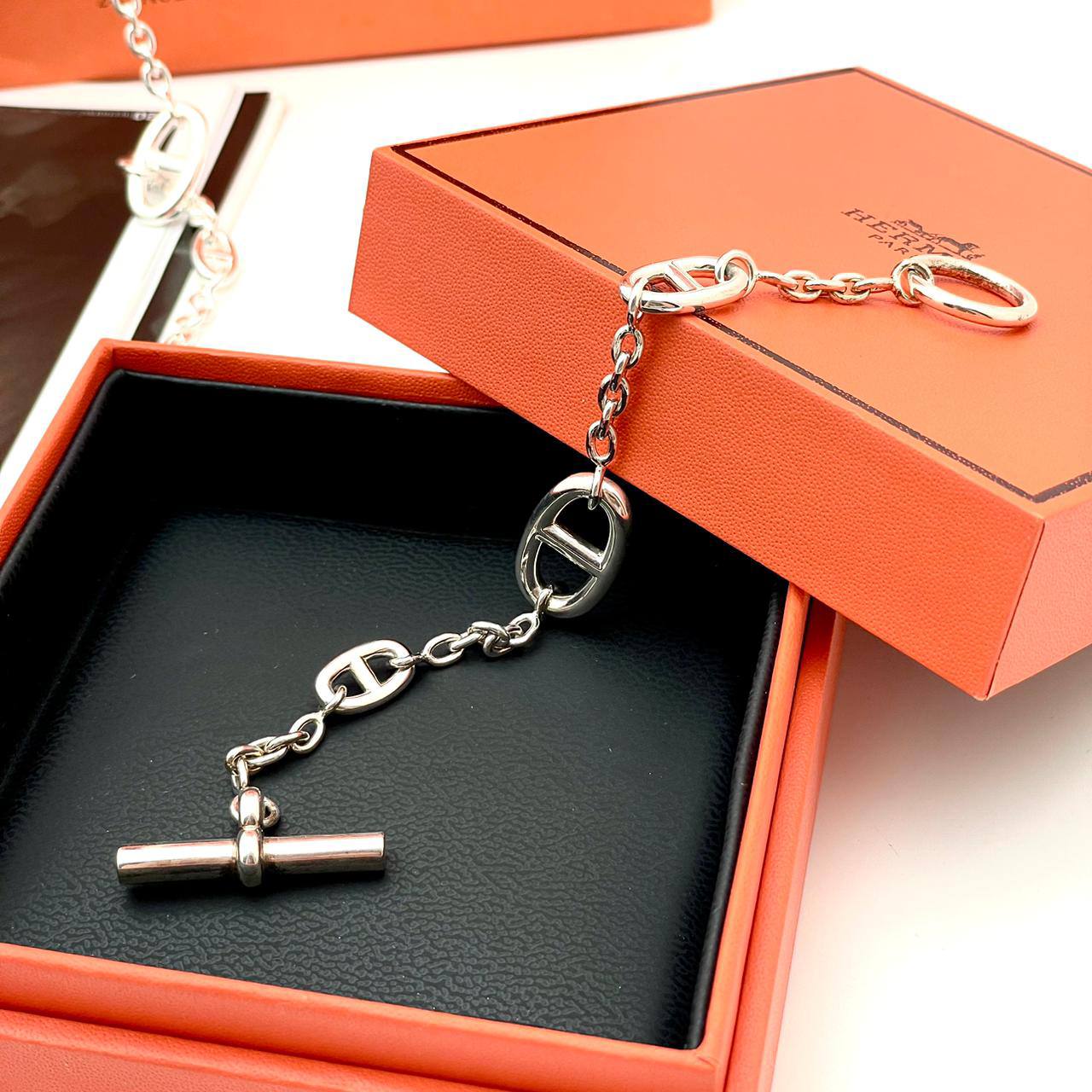 Браслет Hermes LUX-107392 — это элегантный аксессуар, выполненный в узнаваемом стиле бренда Hermes. Браслет имеет серебристый цвет, цепную структуру и застежку в виде штанги. Этот браслет станет отличным дополнением к любому образу.