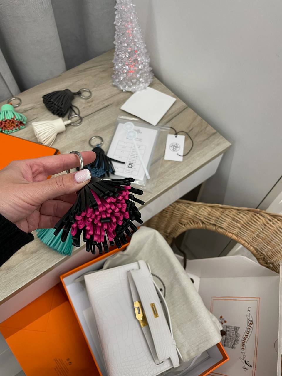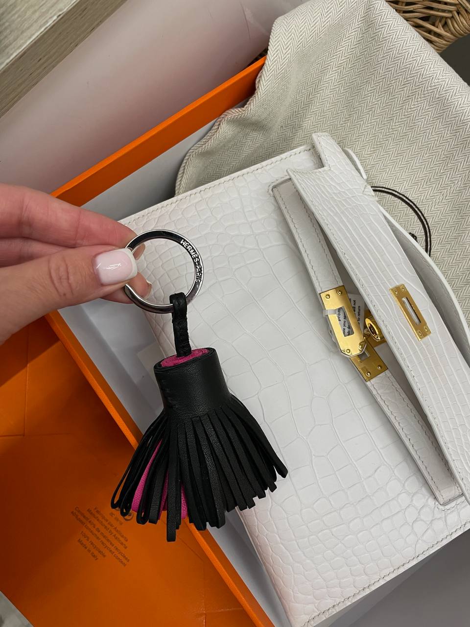 Брелок Hermes LUX-113114 представляет собой стильный аксессуар, выполненный в классическом стиле. Он выполнен в черном цвете с розовой подкладкой и серебристым кольцом. Этот брелок может использоваться как украшение для сумки или в качестве брелока для ключей.