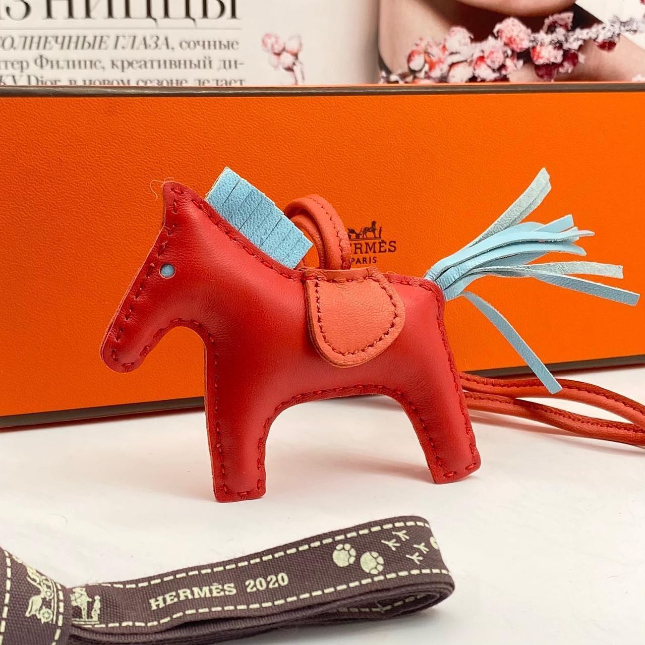 Элегантный брелок Hermes LUX-46526 в форме лошадки станет стильным дополнением к вашим аксессуарам. Изделие выполнено в ярких контрастных тонах, сочетая красный и оранжевый оттенки кожи, с голубыми элементами, имитирующими гриву. Логотип Hermes Paris присутствует на изделии.