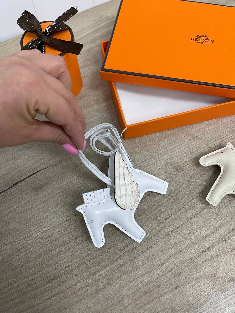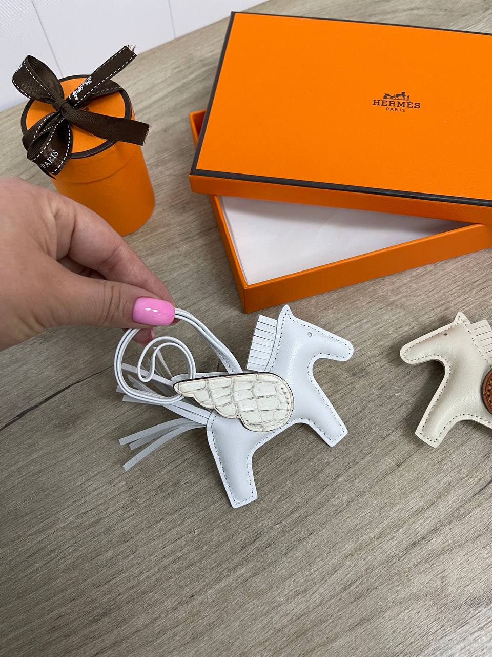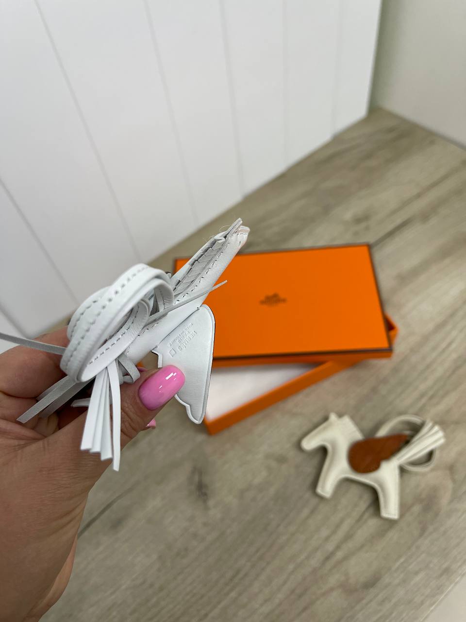 Брелок Hermes LUX-84982 - это стильный аксессуар в форме белого коня с крыльями. Брелок выполнен в элегантном стиле, его можно использовать как подвеску для сумки или ключей, добавляя индивидуальность вашему образу.