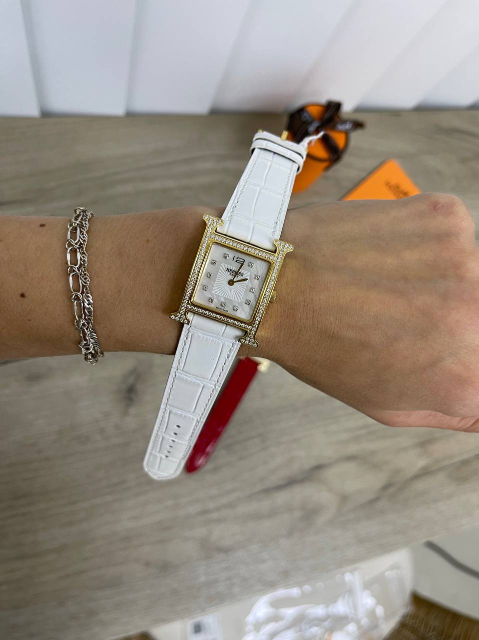 Часы Hermes LUX-80628 представляют собой изысканный аксессуар, сочетающий в себе элегантность и роскошь. Белый ремешок из кожи аллигатора гармонирует с золотистым корпусом, украшенным бриллиантами. Эти часы – воплощение утонченного вкуса и безупречного стиля.