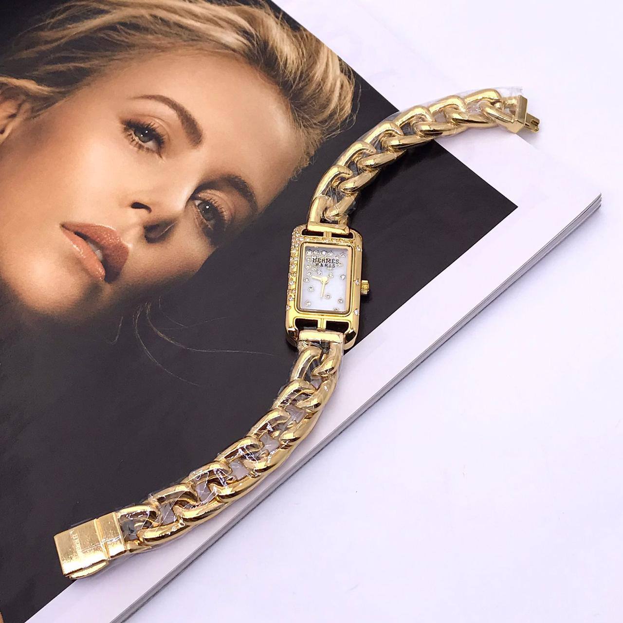 Часы Hermes LUX-81612 - это роскошный аксессуар, сочетающий в себе элегантность и изысканность. Золотистый оттенок корпуса и браслета, в виде массивной цепи, добавляет часам особую привлекательность. Они идеально подойдут для создания неповторимого образа и подчеркнут индивидуальность своей обладательницы.