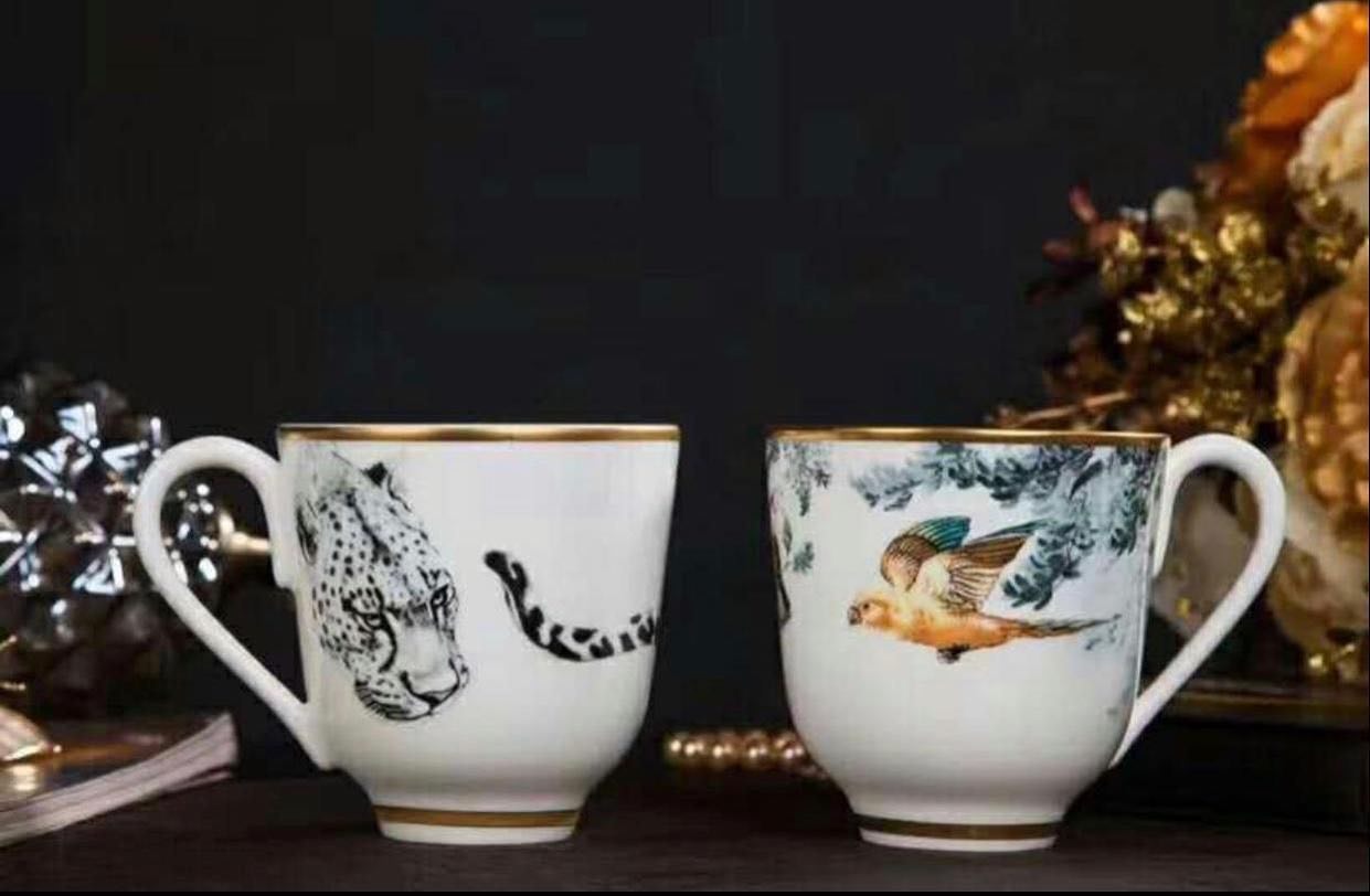 Чайная пара Hermes LUX-35596 представляет собой изысканный набор, сочетающий классическую элегантность и оригинальные дизайнерские решения. На чашках изображены стилизованные рисунки, один из которых украшает голова и часть туловища леопарда, а другой — летящая птица в окружении ветвей.