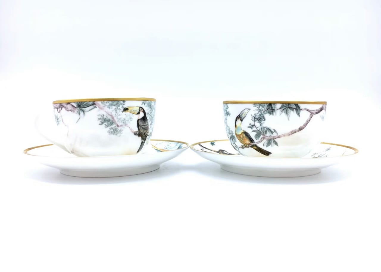 Эта чайная пара Hermes LUX-22138, выполненная в изысканном стиле, станет прекрасным дополнением к вашей сервировке. На белоснежном фоне чашек и блюдец изображены живописные тропические сцены с туканами, сидящими на ветвях деревьев. Золотистый ободок придает изделию нотку роскоши и элегантности, делая его идеальным для особых случаев.